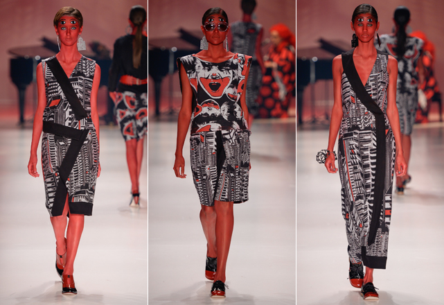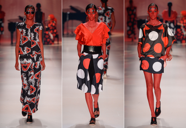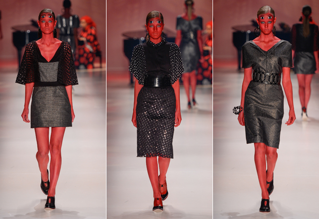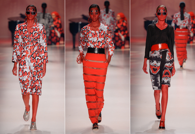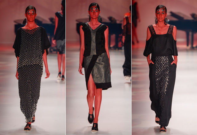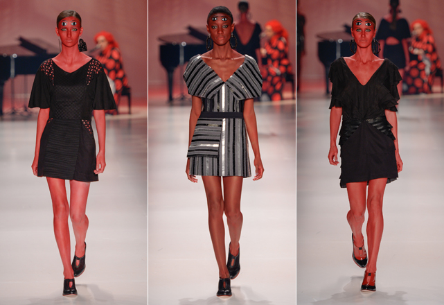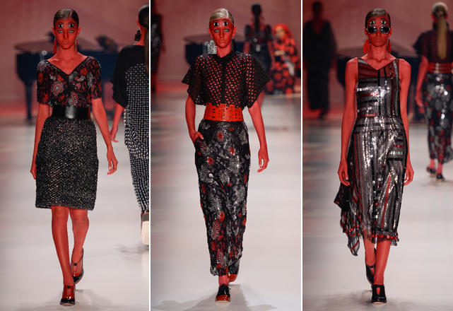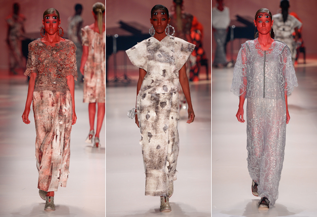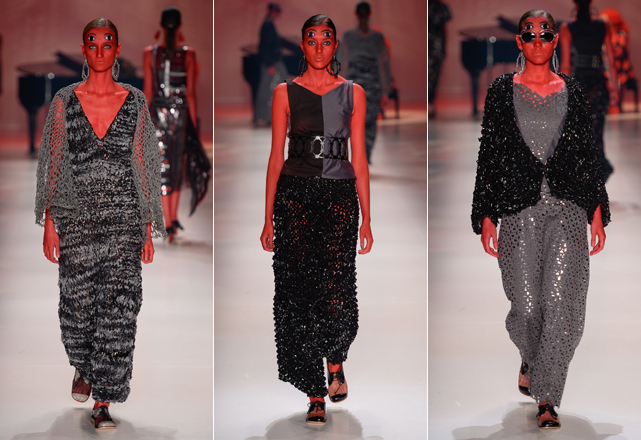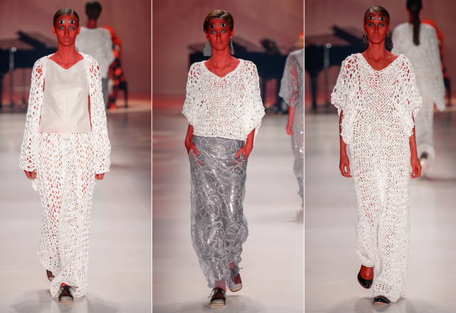 Em contraposição, vestidos fluidos, com canutilhos, babados, transparências e renda. Os tricôs de papel manifestam, por si só, este jogo de contrastes – leves e rígidos. Apagado o vermelho curumim que tingiu a pele de cada uma das modelos, a imagem agrada, e muito.