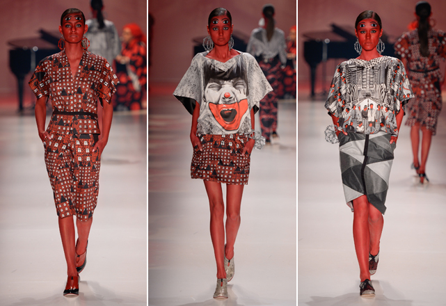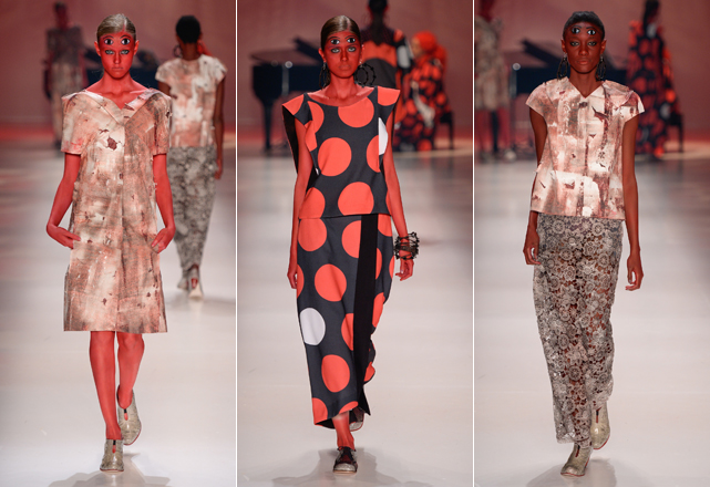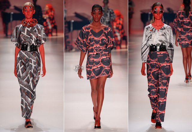 As torres de concreto e o opressor mundo das metrópoles aparecem nas peças estruturadas e afastadas do corpo, em tons de cinza colorido, entre pontos de vermelho – o sangue, nas palavras do próprio criador.