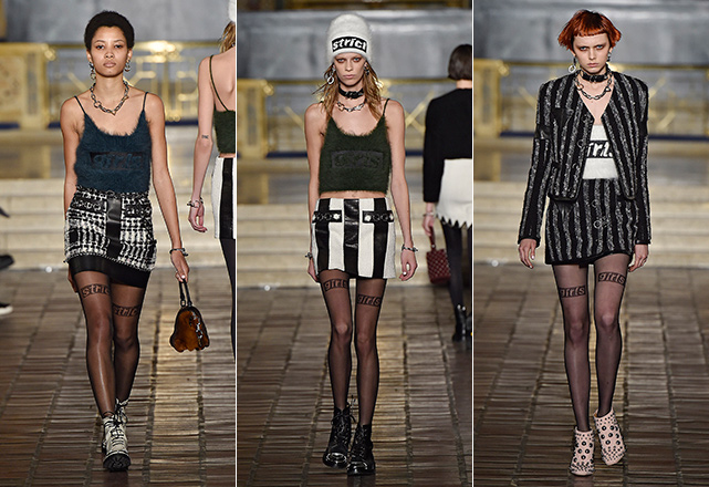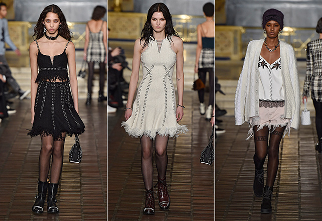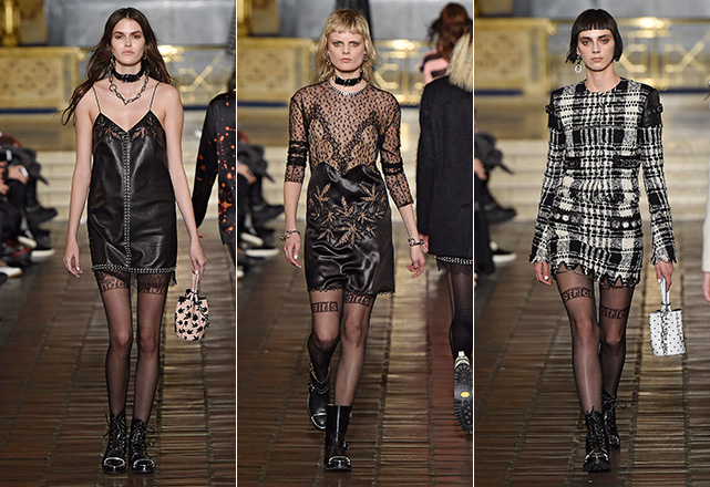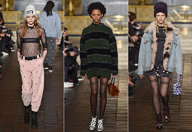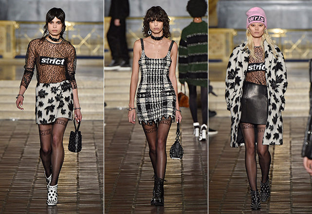 O estilista se mostra mais conectado do que nunca com a estética e questões políticas mais quentes do momento: sexismo, racismo, empoderamento feminino, legalização de drogas e a moda agender. Todas as questões aparecem trabalhadas subversivamente em conjuntinhos punk com estampa xadrez e recortes de couro, mini vestidos com barras desfiadas, minissaias de couro com tops felupos com as palavras girls, strict e tender estampadas como outdoors publicitário, além de motivos bordados em algo bastante similar à folha da maconha. Tudo arrematado por acessórios pesados, como botas com tachas, chockers de metal, correntes e gorros de lã. Território familiar para Wang, é fato, mas com boa sacada e mensagens espertas nas entrelinhas.