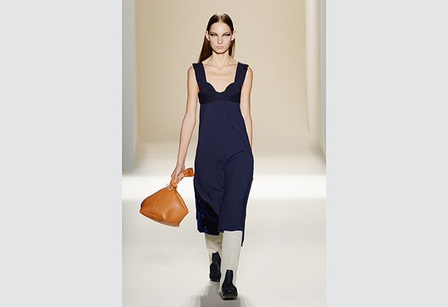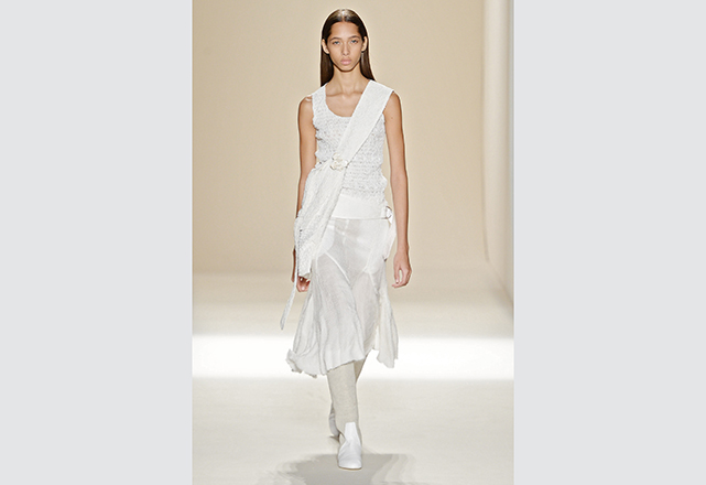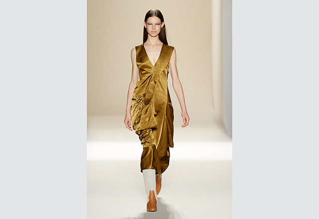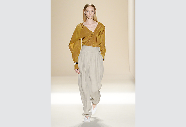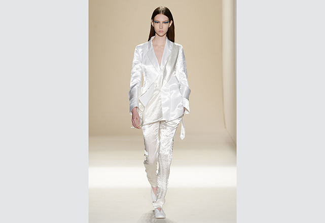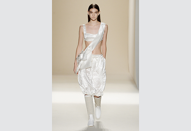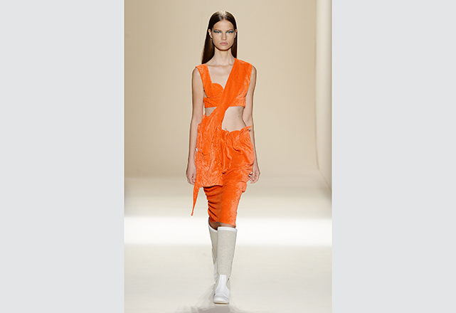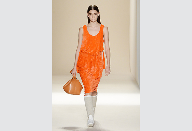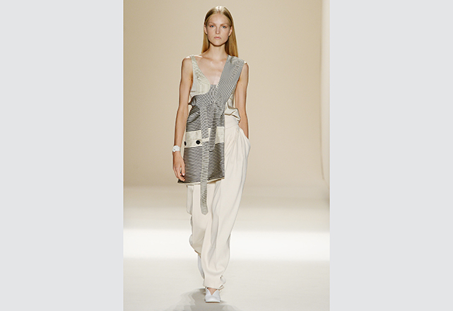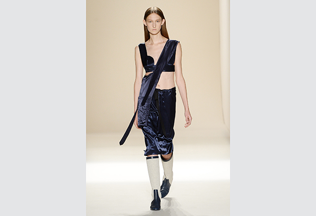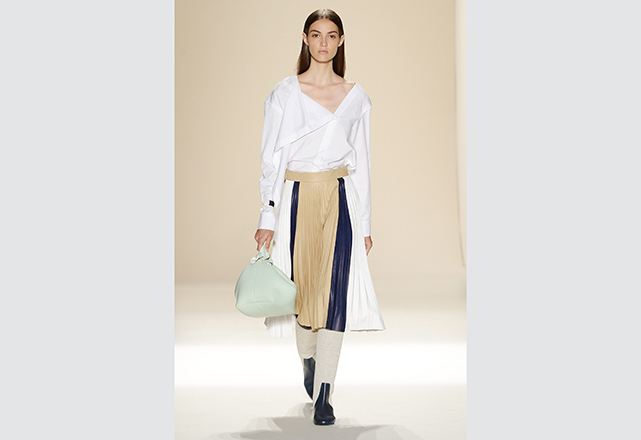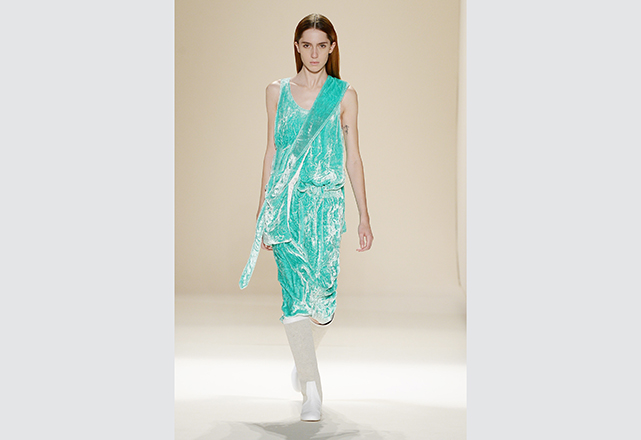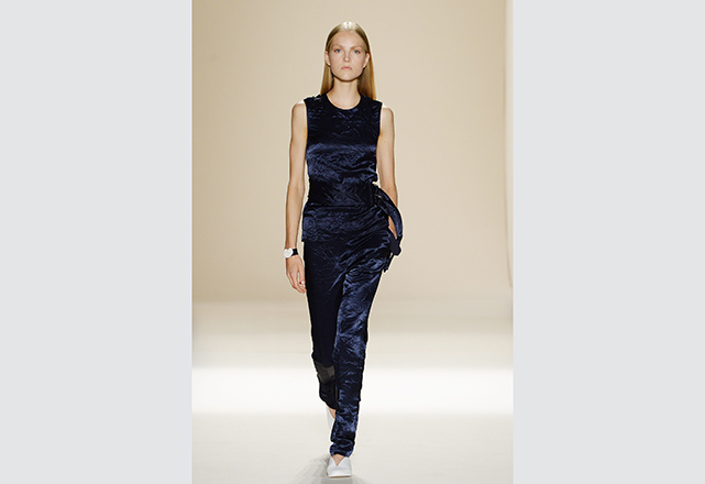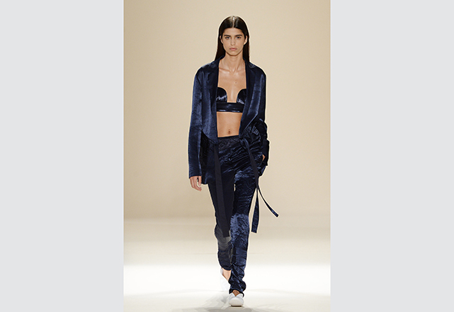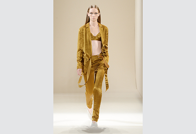 Em vez dos famosos saltos que a estilista usa, ela escolheu apresentar botas, ora brancas, ora bicolores. Há também mistura de tops com blazers, robes com calças… E muitas peças plissadas com modelagem evasê. O veludo molhado ganha destaque ao lado de fendas e recortes estratégicos, que mostram e escondem em uma brincadeira interessante.