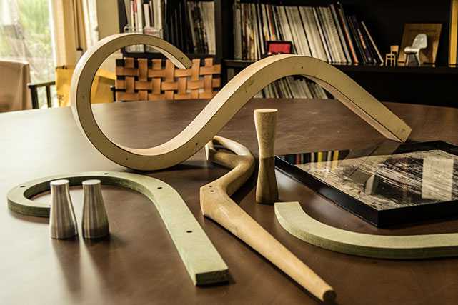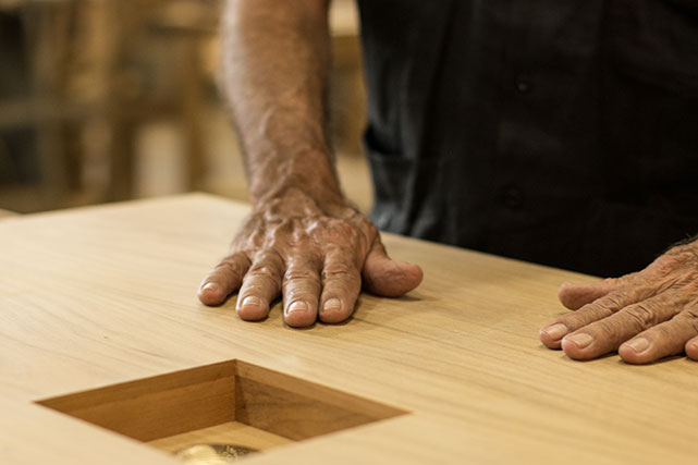 As madeiras descansam rodeadas pelos mestres marceneiros que, no convívio com elas, vão percebendo e reconhecendo suas idiossincrasias, texturas, densidades, cheiros. E quando chega o momento de transmuta-las em mesas, cadeiras, armários, biombos e o que mais for, eles, em respeito a sua integridade, não lhes cravam pregos, o que seria uma violência, e, seguindo os projetos de Etel, dela mesma ou daqueles que ela representa, cortam-lhes com apuro, cientes de suas fibras; alisam-nas por meio de uma sucessão hierárquica de lixas, juntam-lhes as partes pela via de cavilhas.