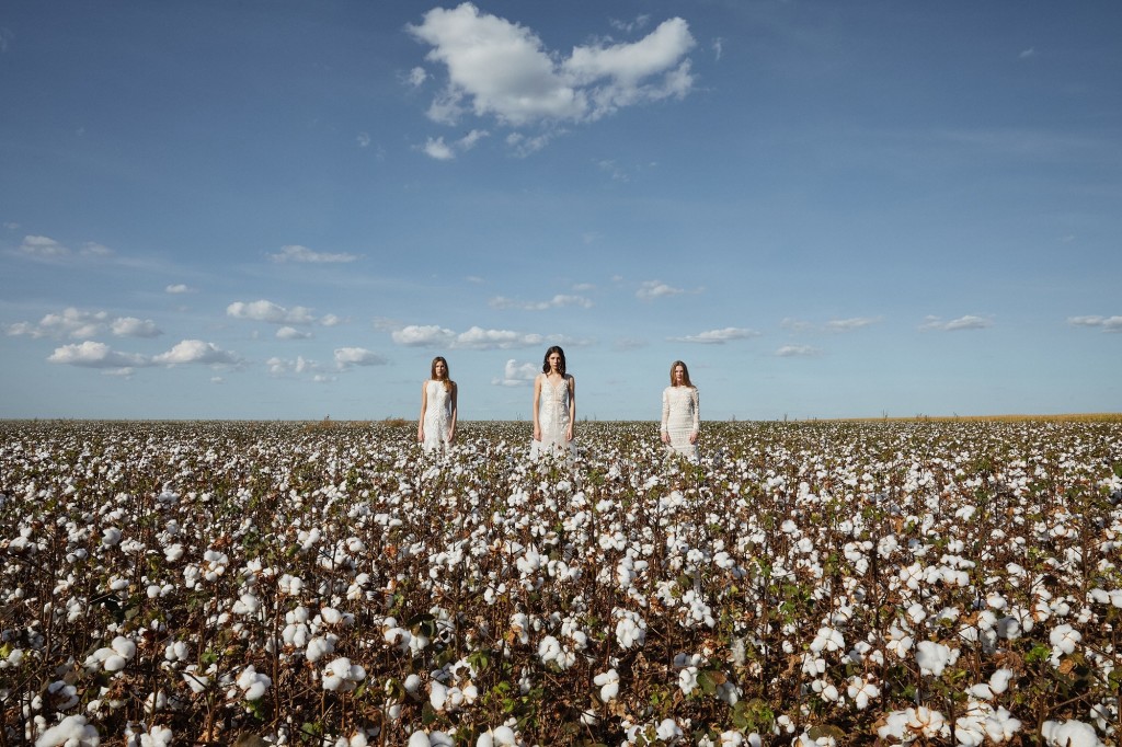 Para alavancar a ideia, ela buscou inspiração em um desejo antigo: fotografar a céu aberto em uma fazenda de algodões. “Viajei para o Mato Grosso algumas vezes para amadurecer a ideia de unir o azul do céu com os tons de palha e marrom da plantação”, conta. Foi a partir da locação que Julia compôs a sua primeira campanha. Resgatou os seus trabalhos iniciais mais artesanais, como o macramê e o patchwork de rendas, e aliou à ousadia das elaborações atuais.