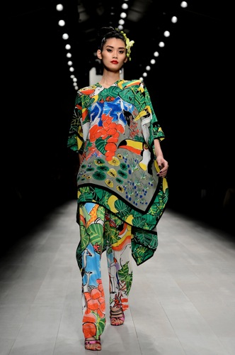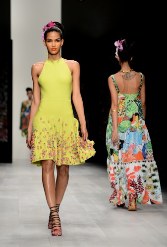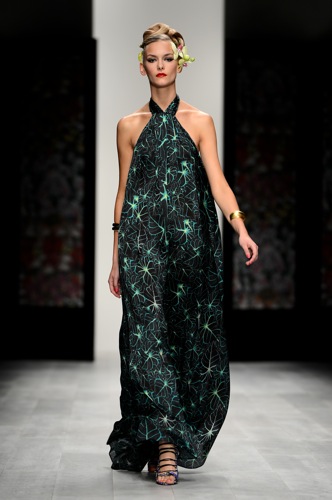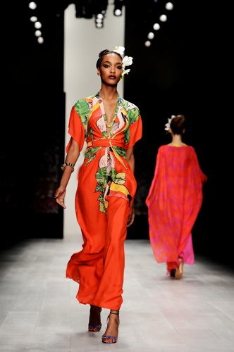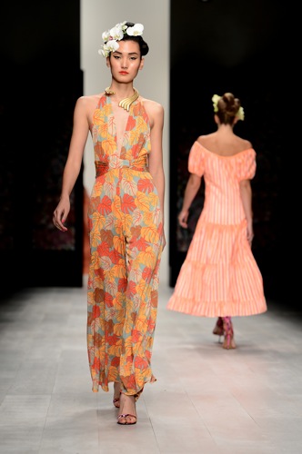 Os penteados das modelos, que lembravam os das gueixas japonesas, ganharam twist bossa nova, adornados com orquideas coloridas. Os caftans, os macacões e os vestidos longos de seda aparecem em cores ricas, como rosa e tangerina, além de prints tropicais de tucanos e papagaios.