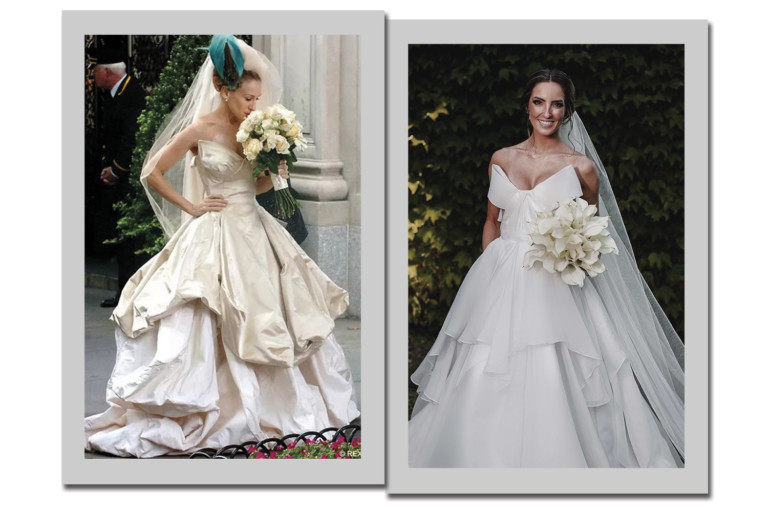 O brilho e o volume voltam com tudo nos anos 2000. O véu, aos pouquinhos, volta a aparecer. Grande inspiração desta tendência foi o icônico vestido usado por Carrie Bradshaw, em “Sex and the City”.
