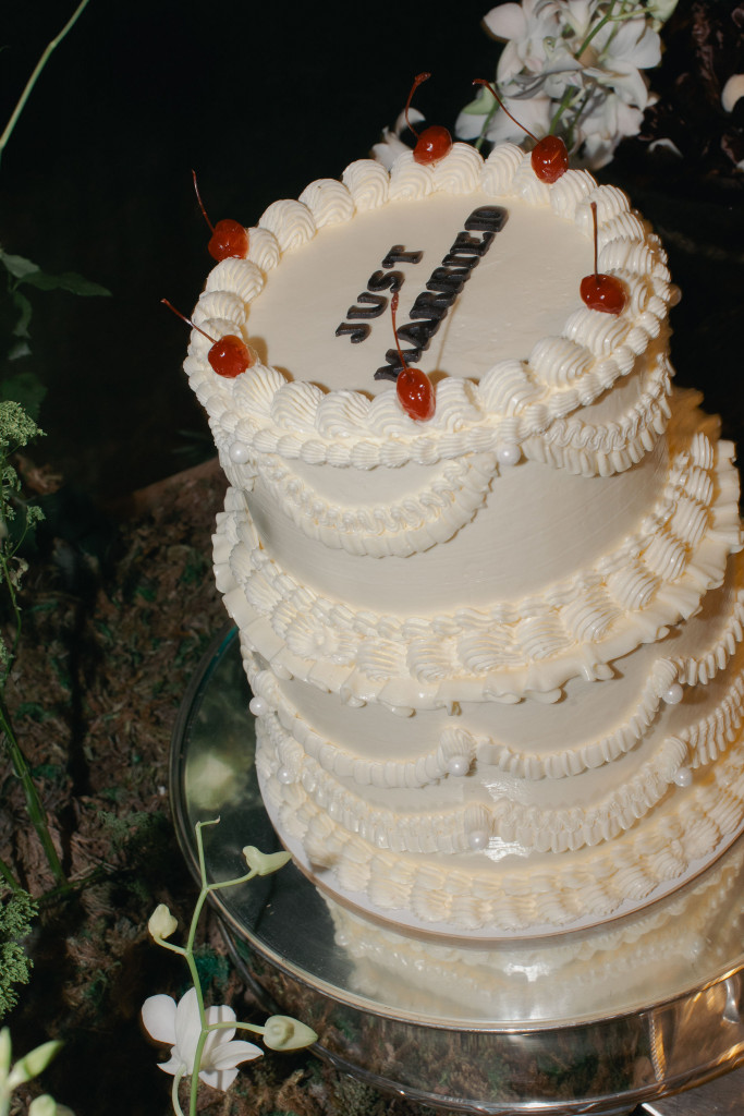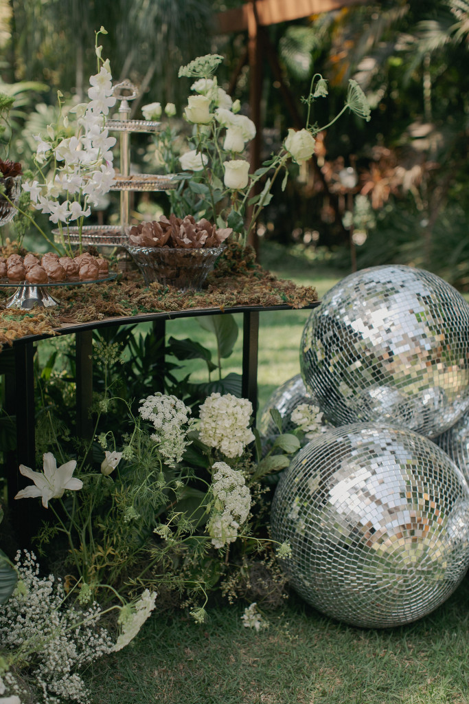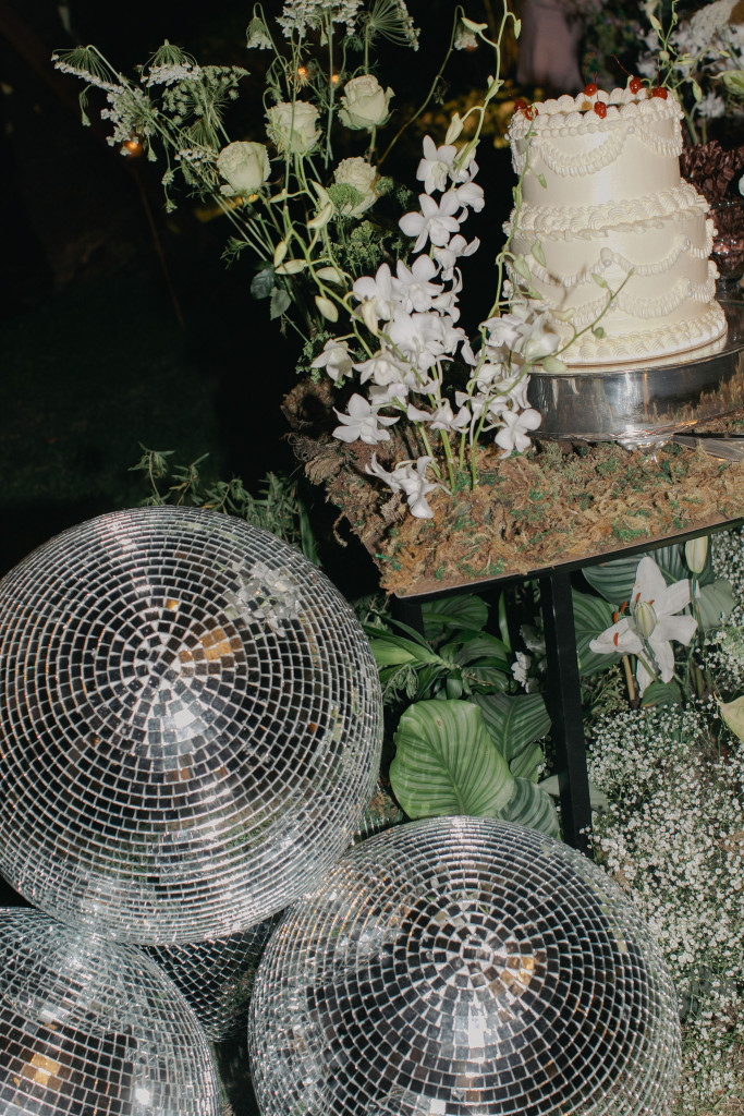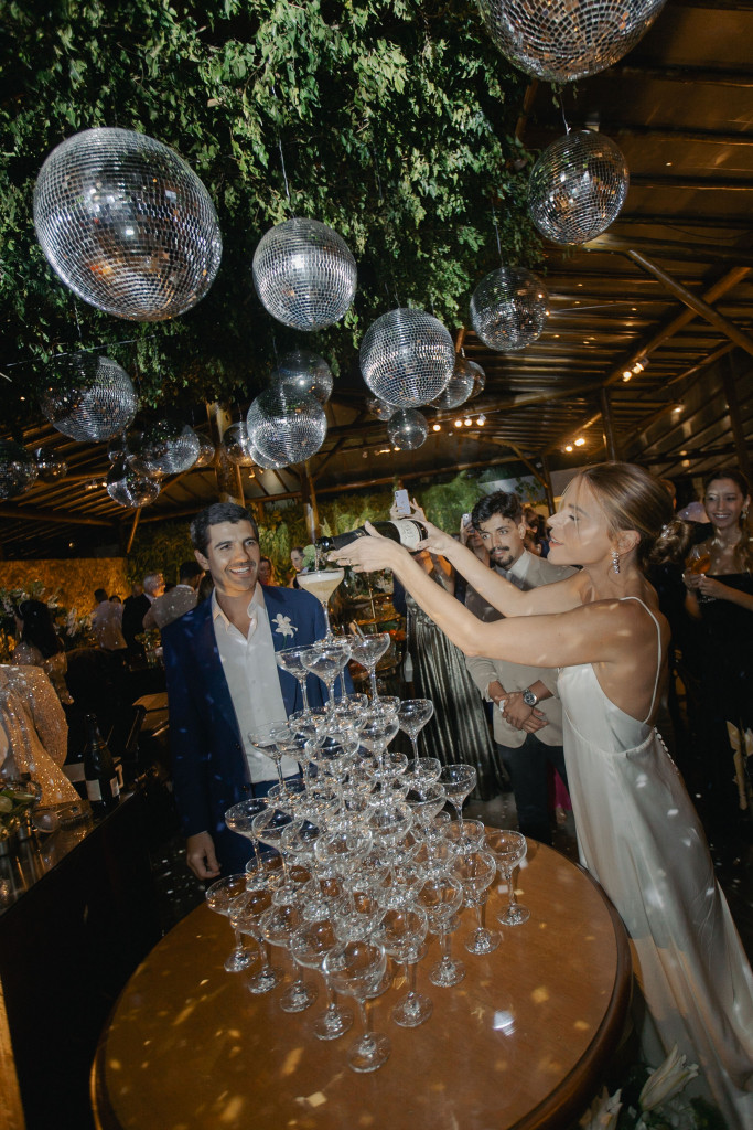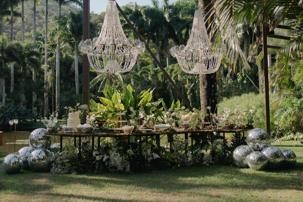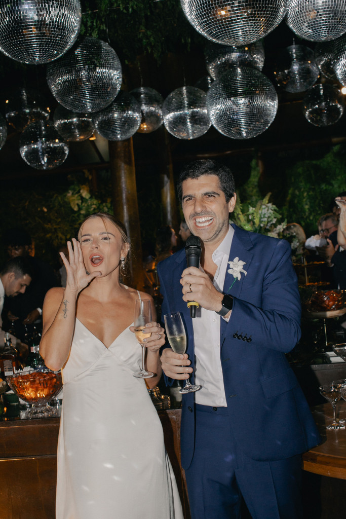 Eu sou bem detalhista, já cheguei com várias referências do que eu queria e ela conseguiu superar todas as minhas expectativas. Em termos de decoração, a festa teve totalmente o meu dna, uma coisa meio disco, com pegada meio vintage, prataria e cristal, e muito dourado no mobiliário. O dna do Pedro ficou presente com o show da banda dele, na qual ele é o vocalista. Sempre foi o sonho dele tocar em seu próprio casamento, e acabou que foi o auge da festa, muito animado!”