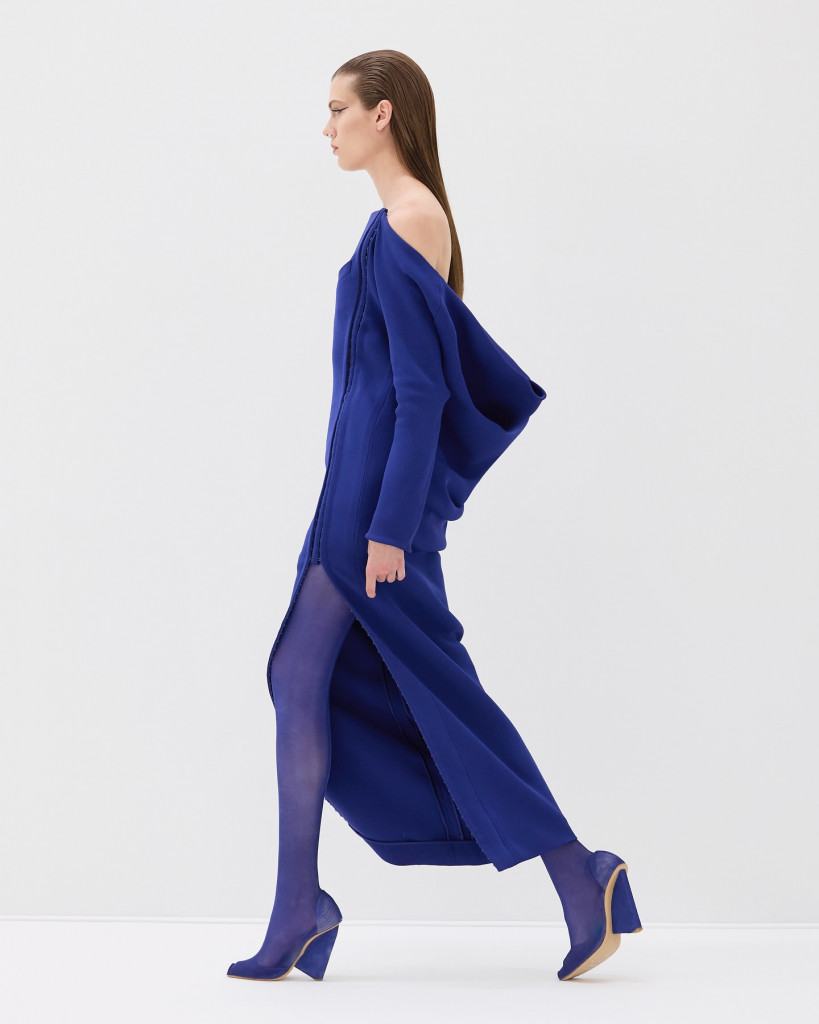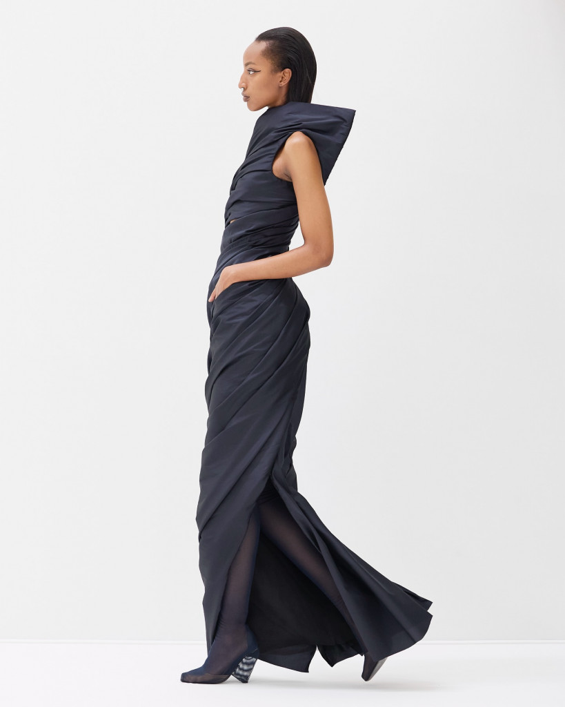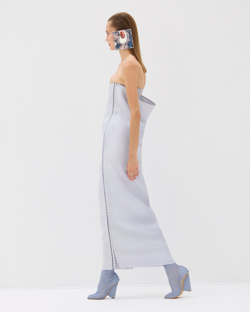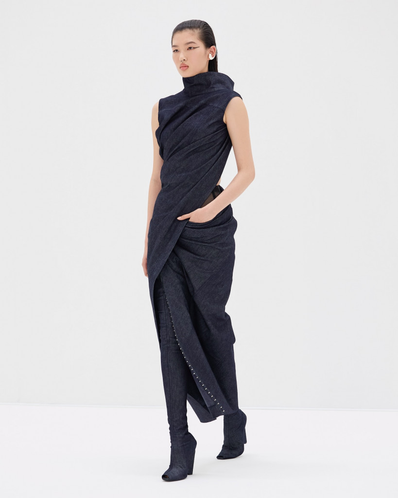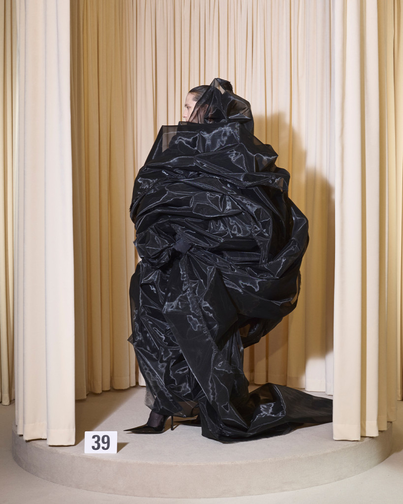 O conceito de transformar roupas “cotidianas” em “alta moda” não é novo para Gvasalia ou para a moda, mas o desfile de alta-costura da Balenciaga reforça esse movimento que definiu uma era. Seu cinismo em questionar todo aquele mise en scène é impressionante. Pode ser com um vestido de papel alumínio ou uma jaqueta jeans, que ganha forro de cetim italiano para preservar seus volumes envolventes. Afinal, a alta-costura é sobre o que está por dentro, né? O que está por fora é questionado ao som de uma meditação guiada que diz: “esteja consciente da marca”.