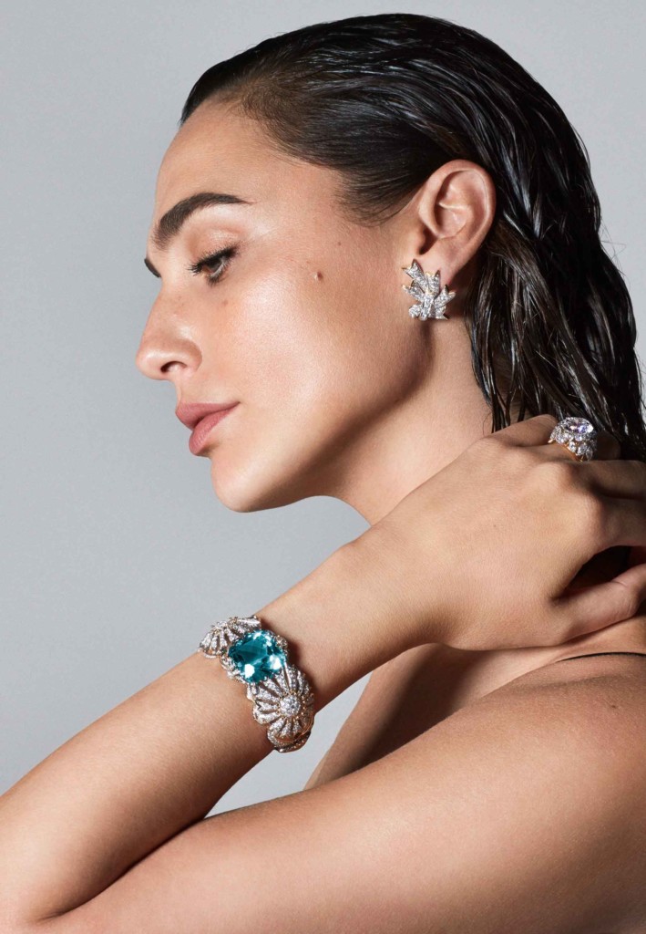 A campanha apresenta Gadot usando peças-chave da coleção Blue Book de primavera, incluindo o colar de diamantes inspirado na flor dente-de-leão que pode se transformar em cinco desenhos únicos, bem como um broche de orquídea, também transformável, e um colar de diamante e safira que evoca a flor cardo.