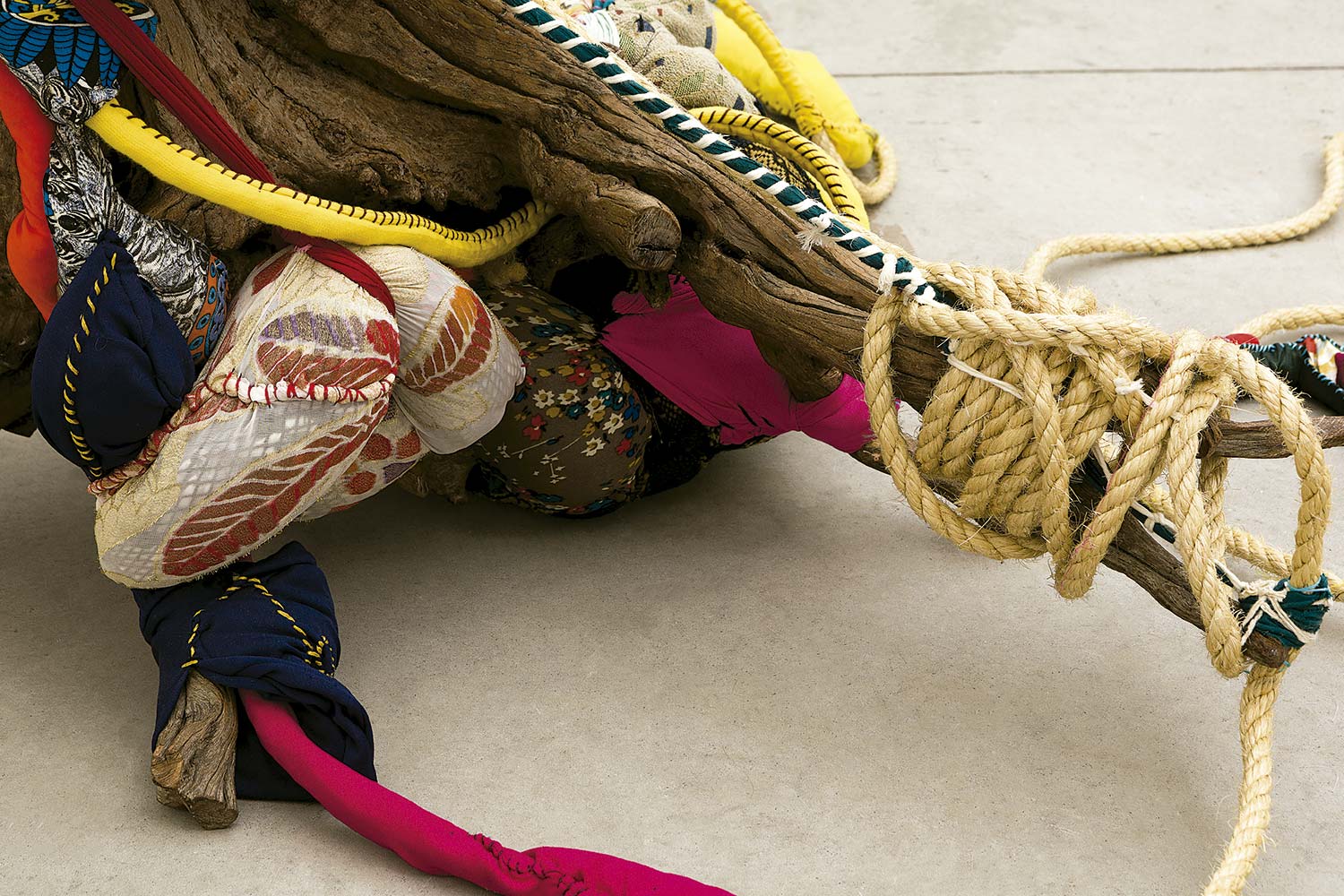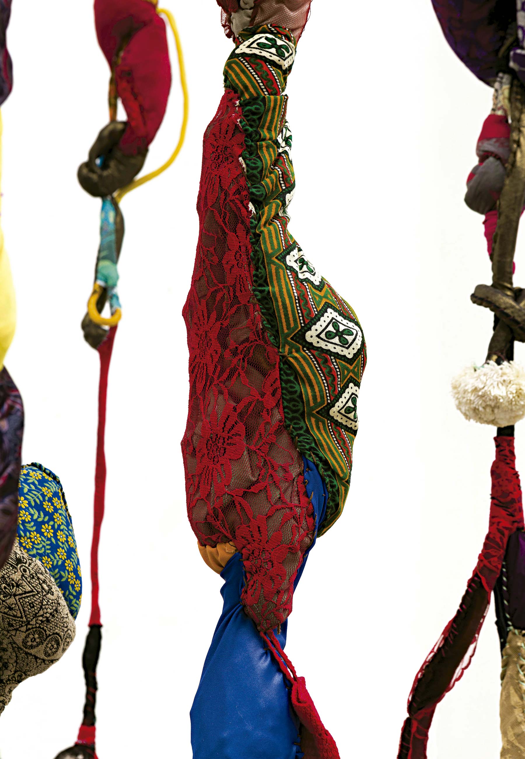 Até os 5 anos, foi criada pela avó, depois foi entregue à família do pai. Essa memória nunca mais a abandonou. “Trabalho muito com afeto, e acho que é isso que busco para mim mesma: afeto”, reflete. “Minha obra demorou para ser aceita, por causa da linguagem que carrega. Adoro a estética africana, amarrações, tudo. Mesmo que nunca tenha ido à África, sempre gostei de ver imagens daquelas mães carregando filhos nas costas com amarrações.”