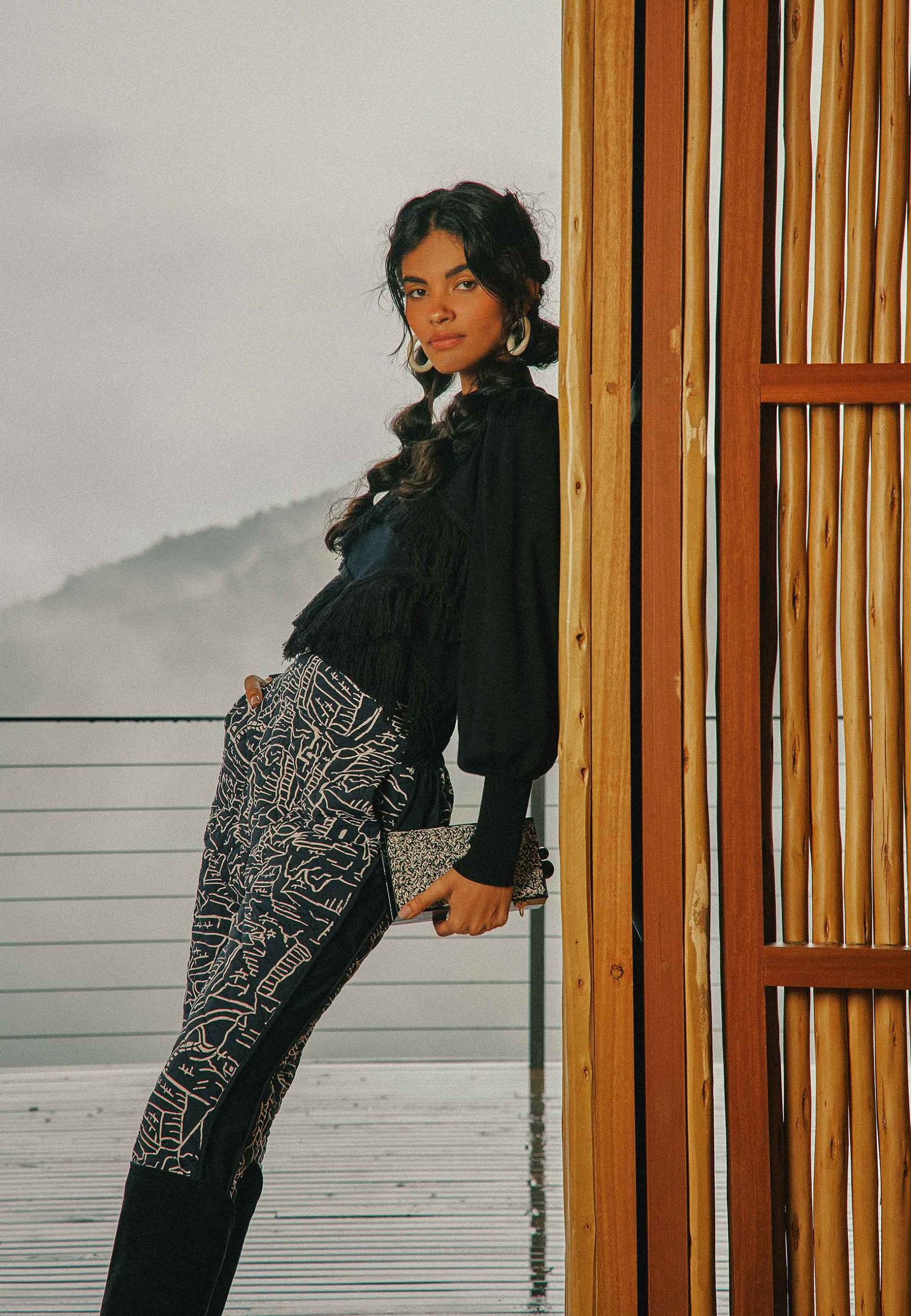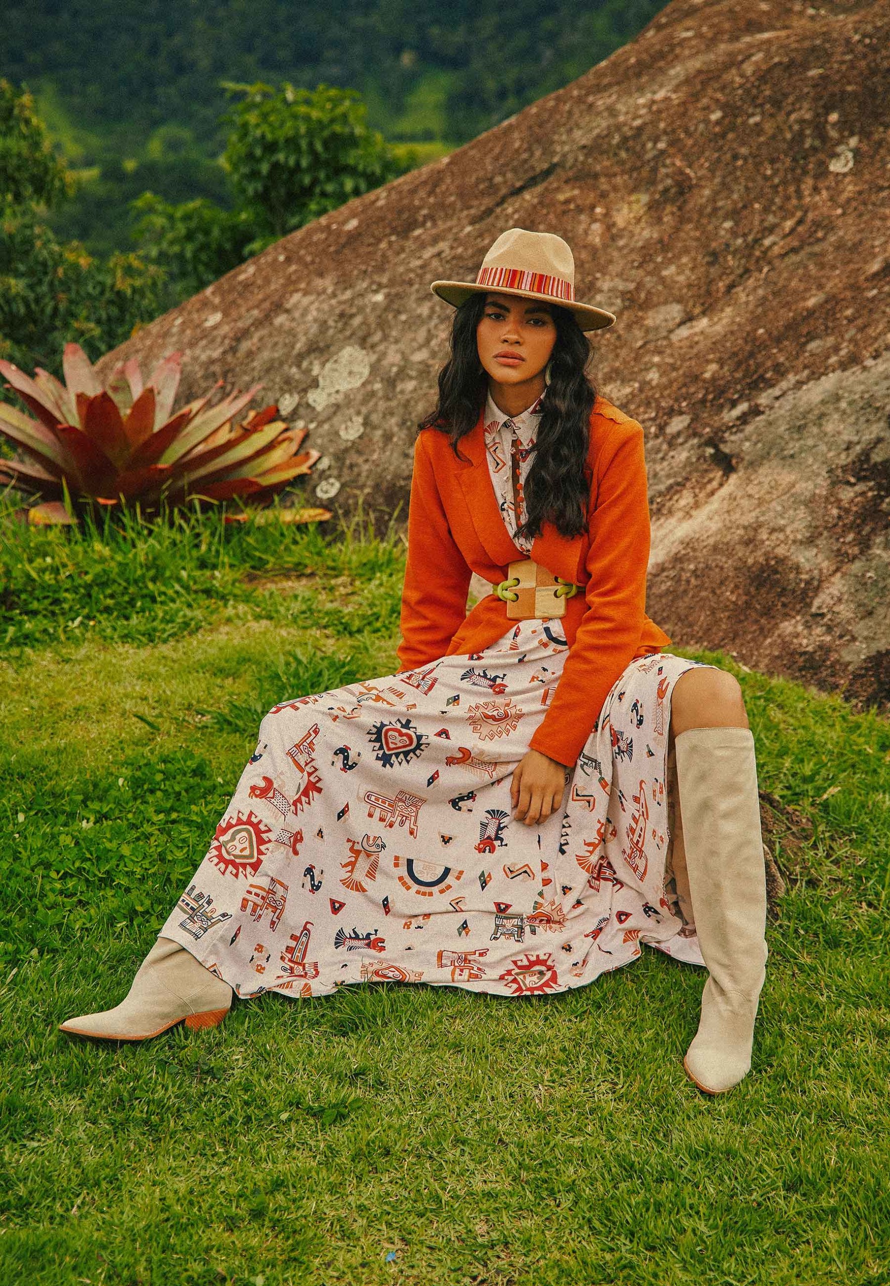 Você encontra o tecido na nova coleção de inverno 2022 da marca, que traz a essência e a riqueza cultural do Peru como fonte de inspiração. Na linha batizada de “El Tiempo”, cores dos looks partem do ocre, rosa plush, lima e marinho, evoluindo para vinho, verde-campestre, preto e off-white. As estampas ganham destaque, inspiradas nas reminiscências de viagem: o relevo de Machu Picchu, as Linhas de Nazca e as cabaças (um tipo de abóbora usado em intervenções artísticas), por exemplo.