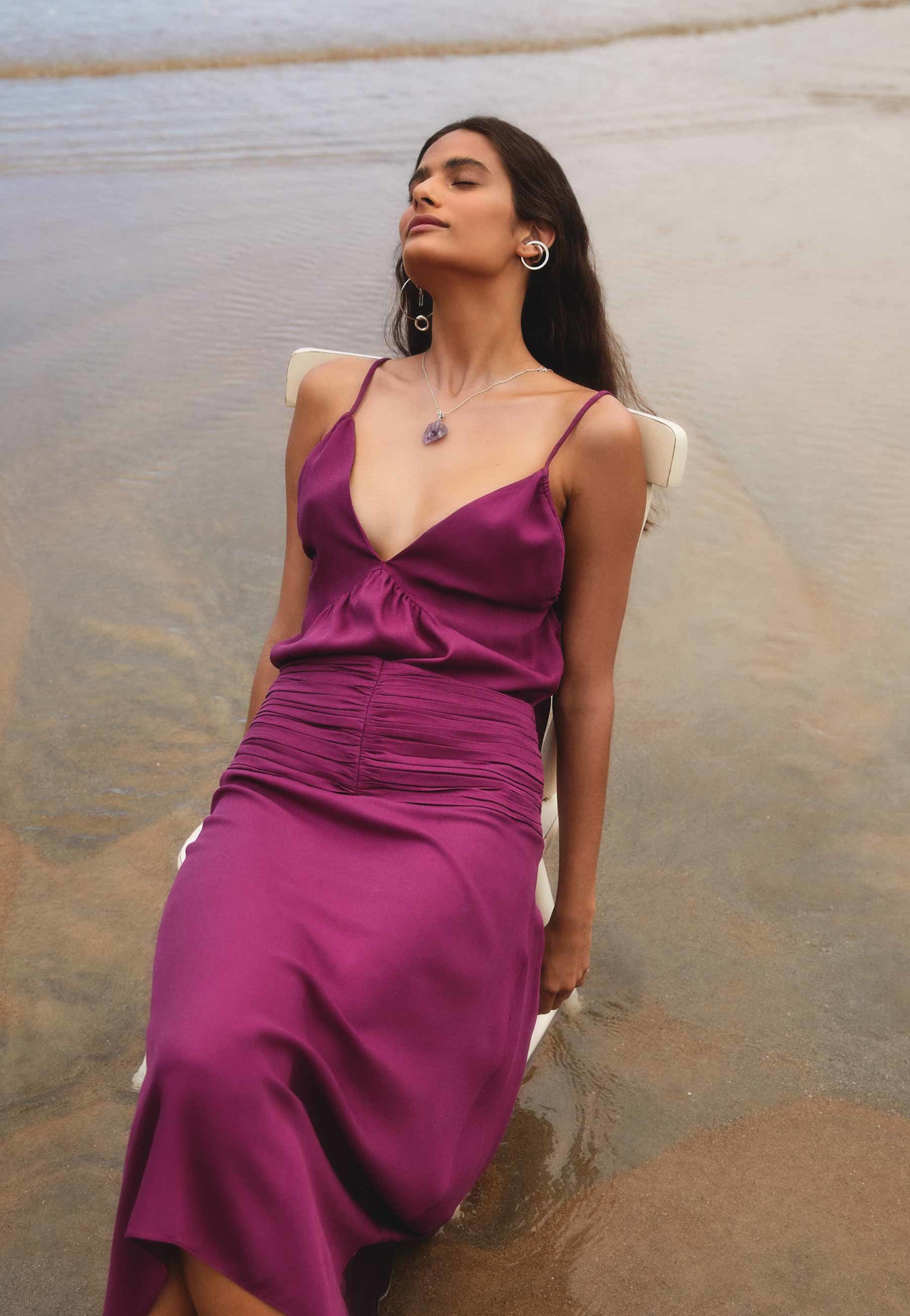 Para os modelos mais fluidos, o destaque é o uso do crepe de modal certificado, com gramatura leve, como visto na regata “Paola”, na saia “Gabriela”, no vestido e na saia “Amélia” e na blusa “Cora”.