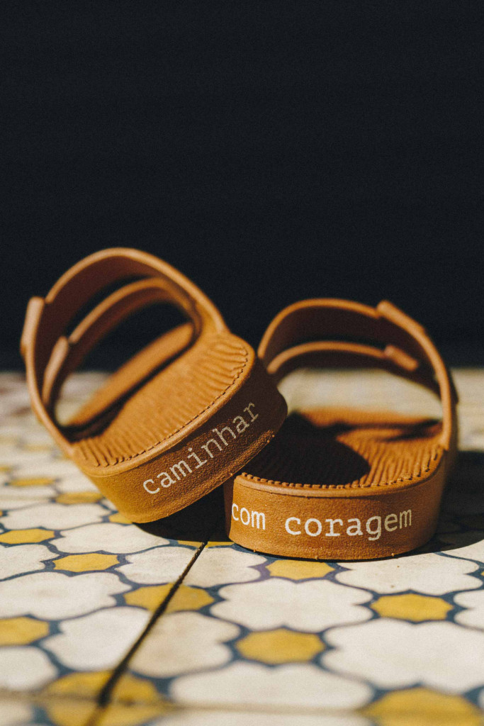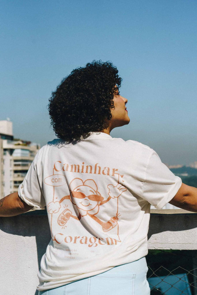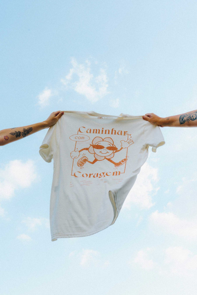 “Caminhar com Coragem” chega aos e-commerces das marcas nesta terça-feira (30.05), composta por camiseta agênero de algodão e um par de Linus na cor marrom quente, ambos estampados com a frase “Caminhar com coragem”. A arte das peças foi desenhada por Lela Brandão.