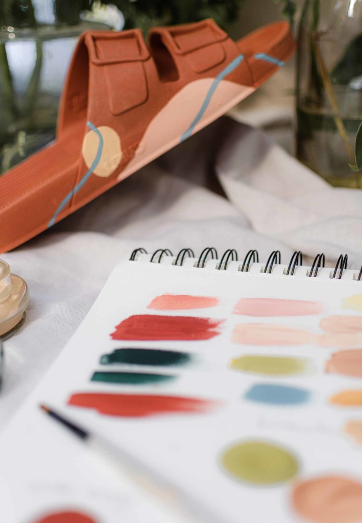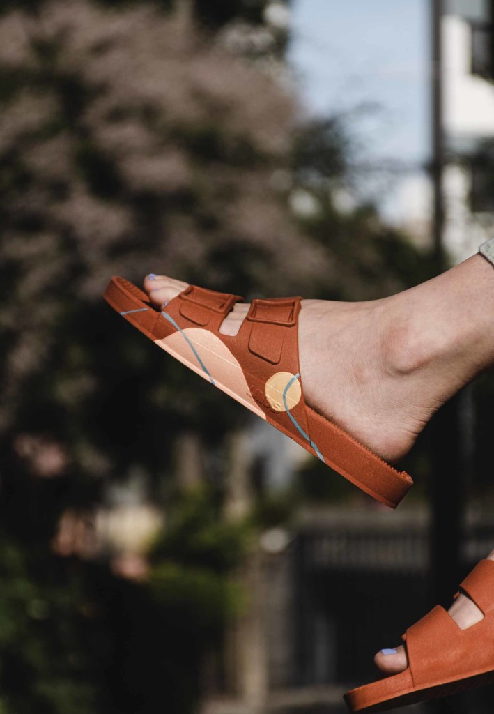 As sandálias são customizadas no ateliê da artista e enviadas com etiqueta e embrulho especiais desta edição. As tintas usadas para criar as produções são à base d’água e têm três combinações diferentes, que podem ser aplicadas sobre as Linus Musgo, Areia ou Tijolo.