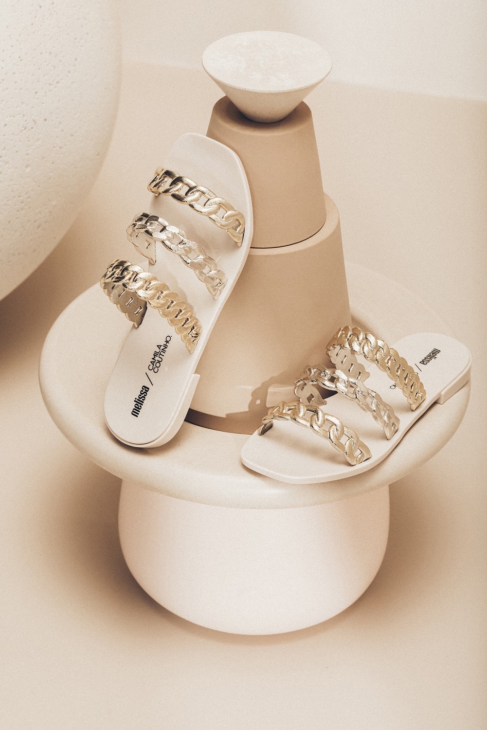 Os três modelos de sandálias – “Unique”, “Feel” e “Dare” – e a bag foram trabalhados em conjunto por Camila e os designer de Melissa. O design da coleção contou com a identificação de um ícone de estilo na identidade dos produtos: as correntes. Com fácil identificação de moda, são um elemento universal, atemporal e versátil.