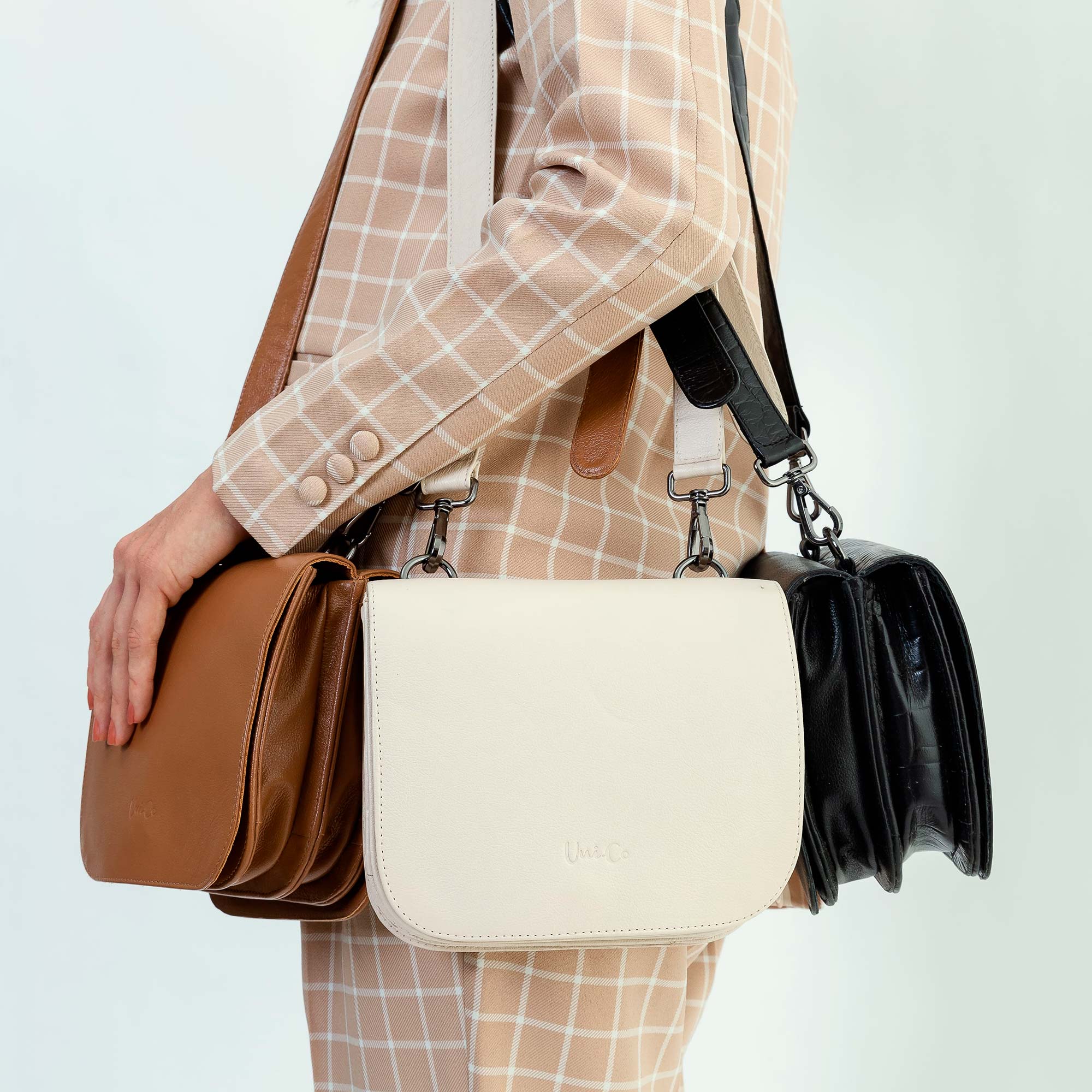 As bolsas e acessórios são feitos à mão em processos totalmente sustentáveis, utilizando o couro excedente da indústria calçadista, resultando em peças atemporais.