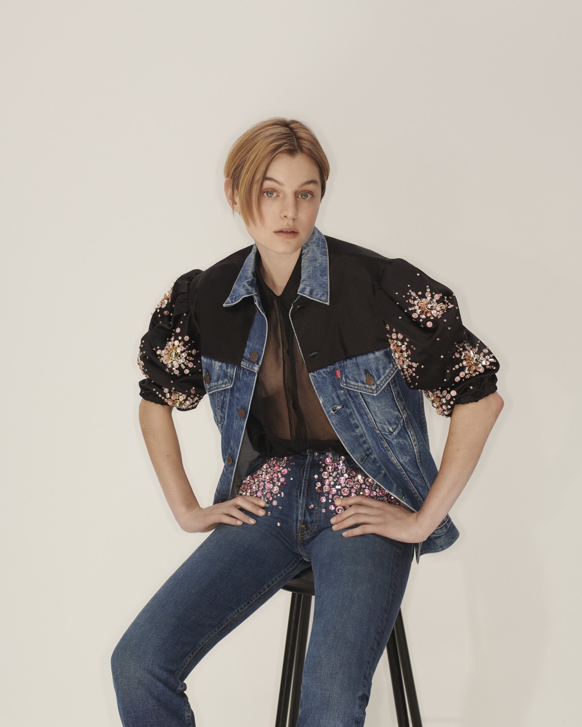 Para criar a coleção, foram selecionados modelos masculinos e trucker jackets que datam dos anos 1980 e 1990, todos resgatados do arquivo da Levi’s. O DNA da Miu Miu fica visível nos cristais bordados à mão, detalhes em couro inspirados no Art Deco, pérolas e outros tipos de aplicações.
