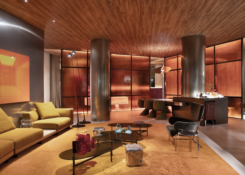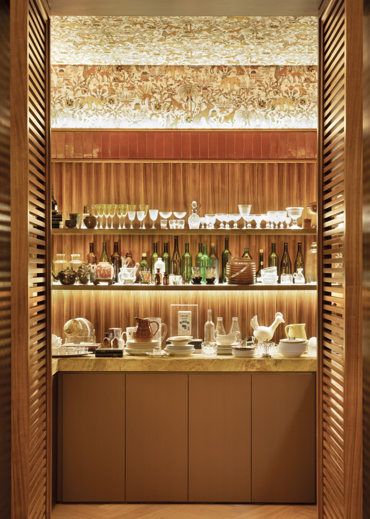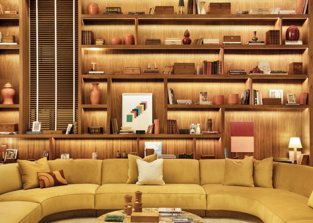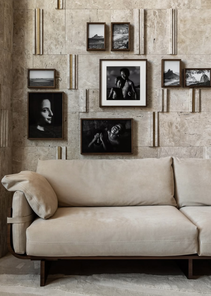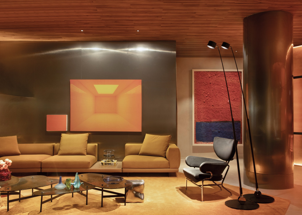 No “Living do Colecionador”, pai e filho — Dado e Guilherme Castello Branco — unem gerações para criar um espaço que celebra a contemplação. Com um pé direito de quase cinco metros, o ambiente abriga, além da marcenaria detalhada com lajotas de cerâmica, uma estante de madeira que se estende até o teto.