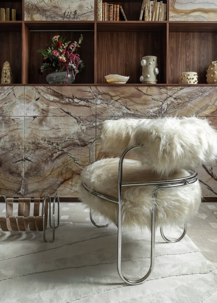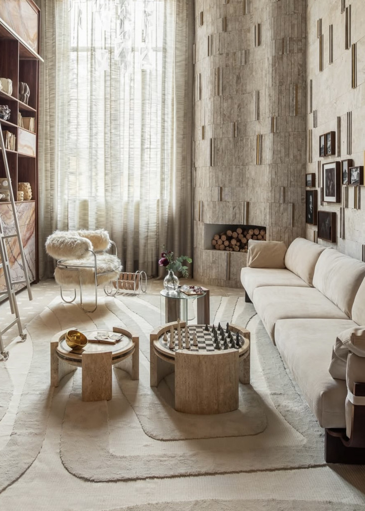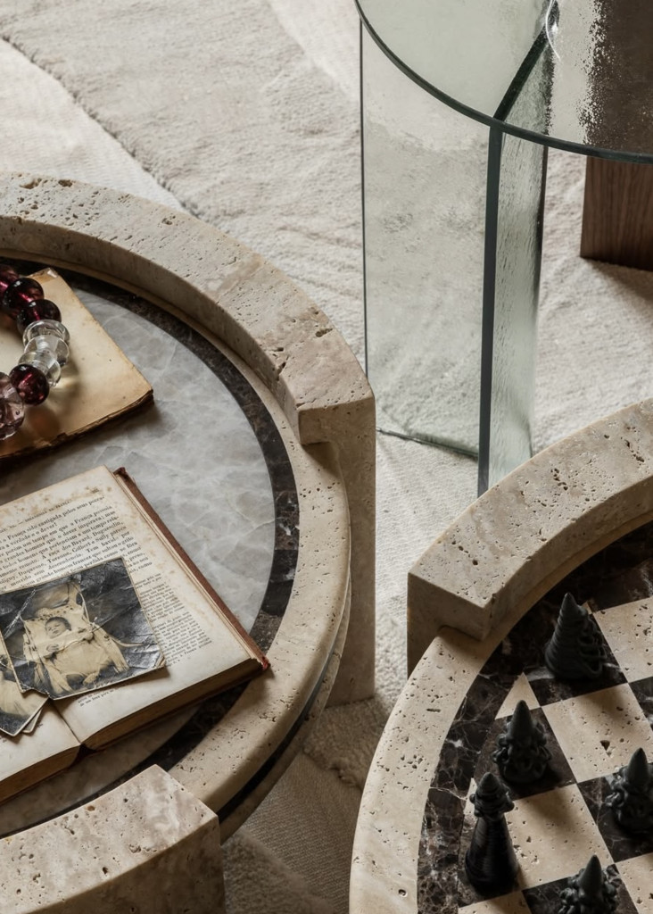 No ambiente “Eternum Vitae”, o La Rous Studio apresenta uma sala que celebra a ancestralidade. Fósseis, minerais e texturas orgânicas compõem a narrativa criada pela arquiteta Larissa Perna, que transita entre São Paulo e Barcelona. O projeto combina o estilo mid-century a uma linguagem contemporânea, com um piso em travertino extraído da Chapada Diamantina representando o Brasil, enquanto o forro abaulado faz referência às abóbadas catalãs.