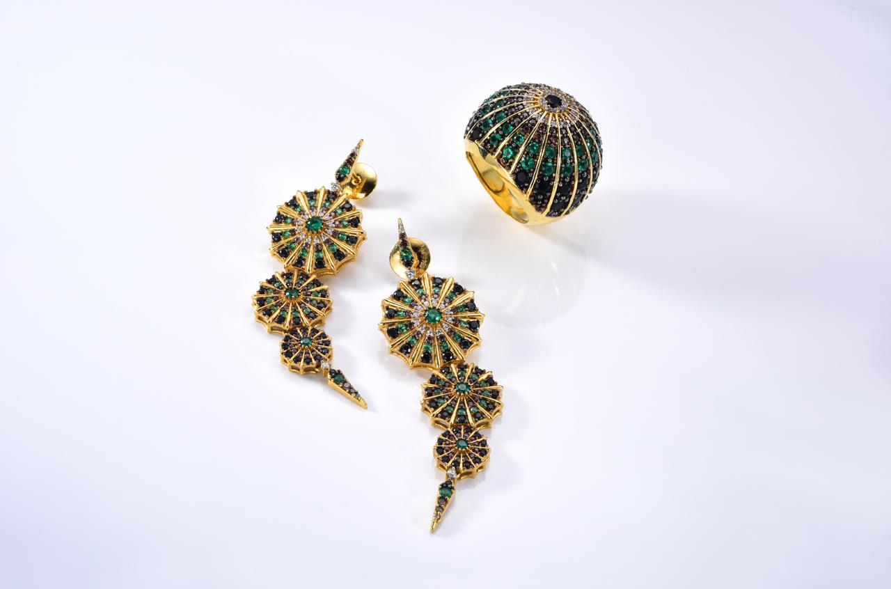 Na composição, esmeraldas remetem à natureza que circunda o Arco e diamantes negros representam as avenidas de Paris. Fundada em 1995, a Dudarillo é uma marca de alta joalheria que busca preservar a tradição da ourivesaria ao mesmo tempo em que promove um luxo consciente — apenas pedras preciosas certificadas e ouro 18k recicláveis são utilizados nas peças. A Bazaar Interiors estará disponível nas bancas a partir de julho deste ano.
