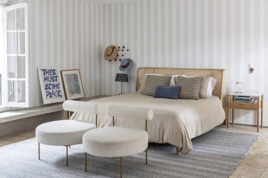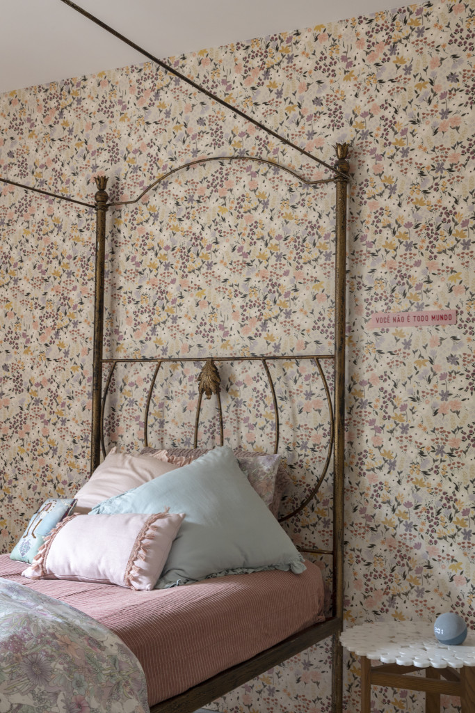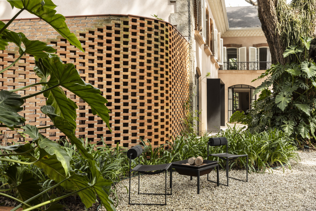 Um dos pontos centrais foi a reforma da varanda. O forro estava muito deteriorado e o espaço acabou se transformando em uma área gourmet, com banquetas da Etel, que se integra à piscina e ao jardim pensado pelo paisagista Henrique Galdino. No fundo do terreno, os antigos anexos de caseiros deram lugar a um pavilhão de tijolos aparentes, projetado para tornar-se um spa futuramente. O quarto do casal ganhou dois closets e banheiros independentes, enquanto os dormitórios dos filhos foram voltados para a piscina. Uma terceira suíte foi pensada para acolher os hóspedes e funciona também como o ateliê de pintura e bordado da filha.