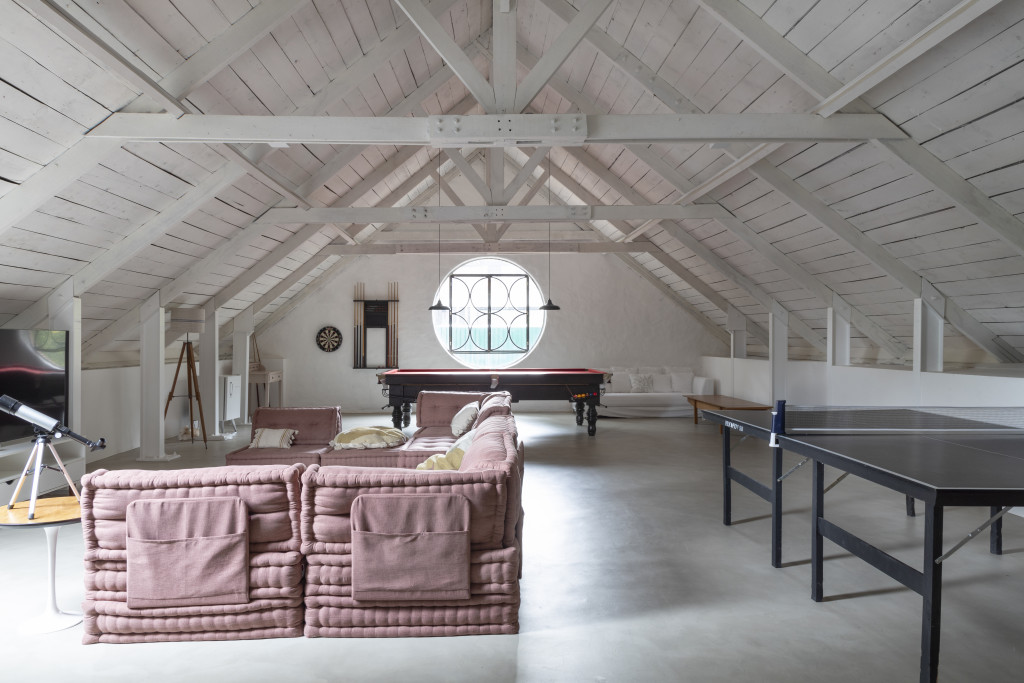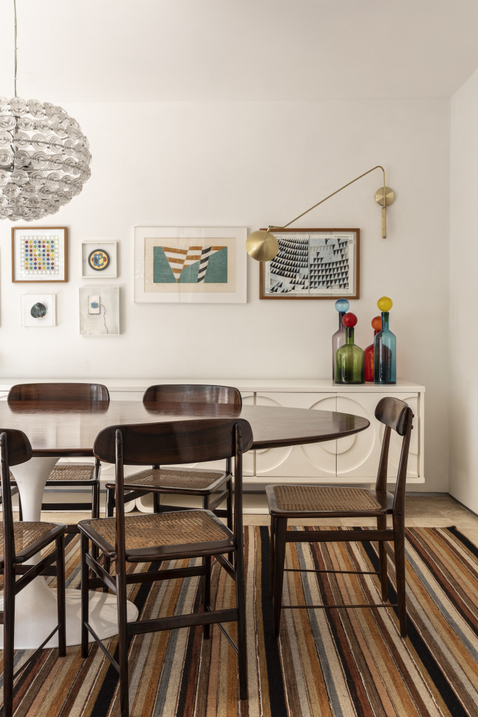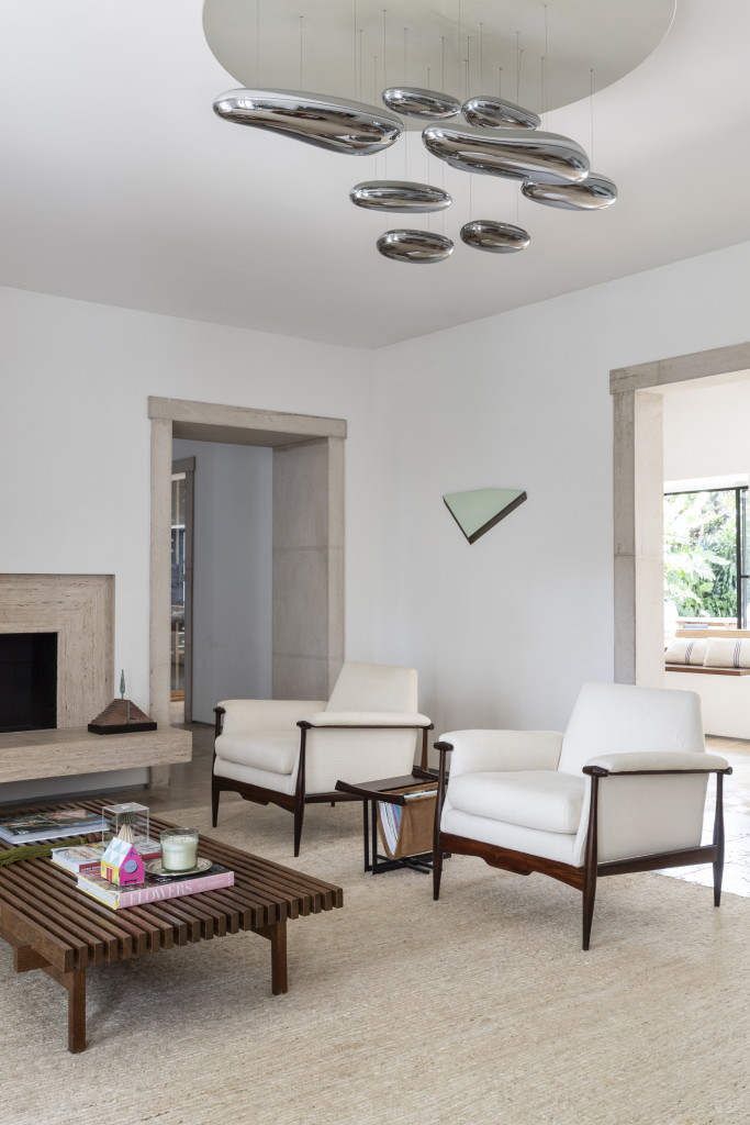 O sótão foi retrofitado por completo e hoje abriga uma sala de ginástica, yoga e pilates, além de um espaço social iluminado naturalmente por aberturas no telhado, com sala de jogos e mesa de sinuca. Os interiores de Bruna Garbin remetem ao modernismo brasileiro em um exercício de garimpo e curadoria afetiva. Peças do acervo da família foram colocadas em diálogo com achados de antiquários cariocas, além de obras de galerias parceiras como a Galatea. Trabalhos de Cruz Diez, Alfredo Volpi e Montez Magno estão entre os destaques.