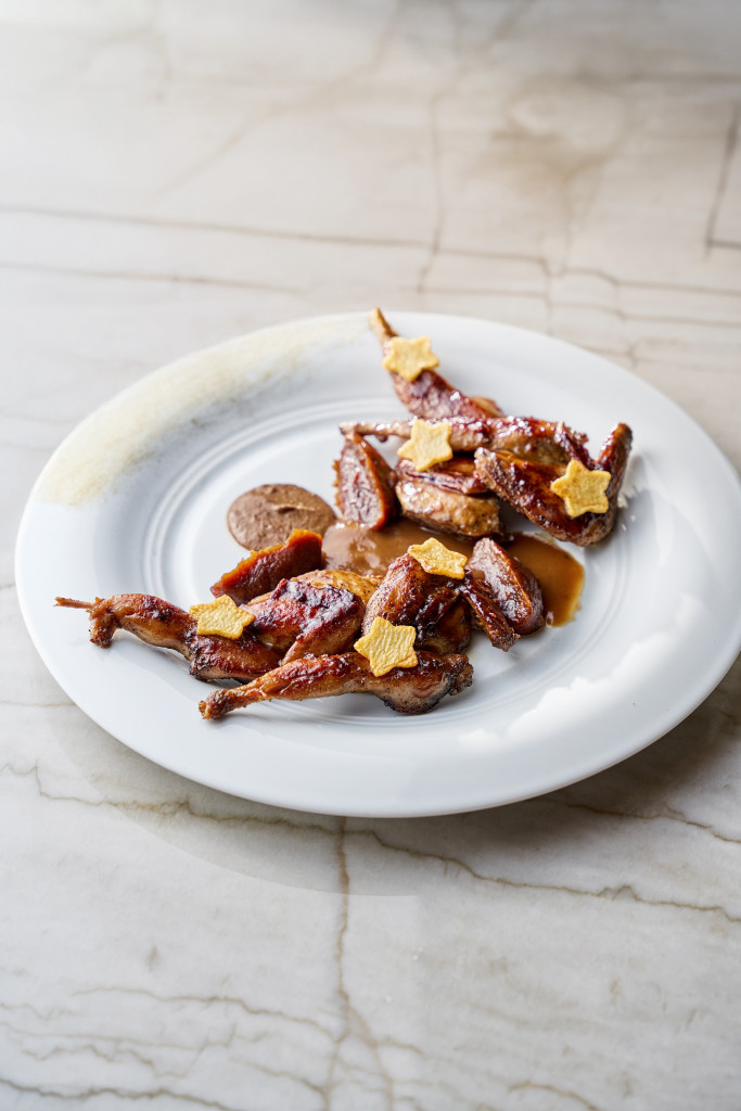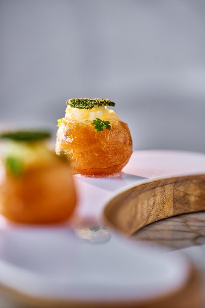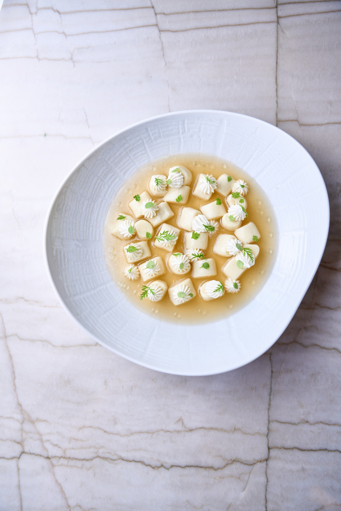 Entre os snacks que apresentam técnicas de conservação, emulsões e bases clássicas da panificação, vale provar a truta levemente defumada com cenoura fermentada sobre massa folhada artesanal. É impressionante e surpreendente o frescor do alho-poró tostado na manteiga noisette e acompanhado de creme de castanha de caju e molho de coco e iogurte artesanal. Mas a maior estrela da noite é o ravioli recheado com tomates doces e fermentados. Coberto por ganache de foie gras e envolto por caldo de galinha, chega à mesa sob um cloche, um símbolo da alta gastronomia do século 18. Não à toa, ele foi apelidado pela chef de “solar”. Ela também evoca uma histórica e cultural brincadeira sobre a origem da massa, se da China ou da Itália, ao servir o dim sum recheado com compota de berinjela defumada.