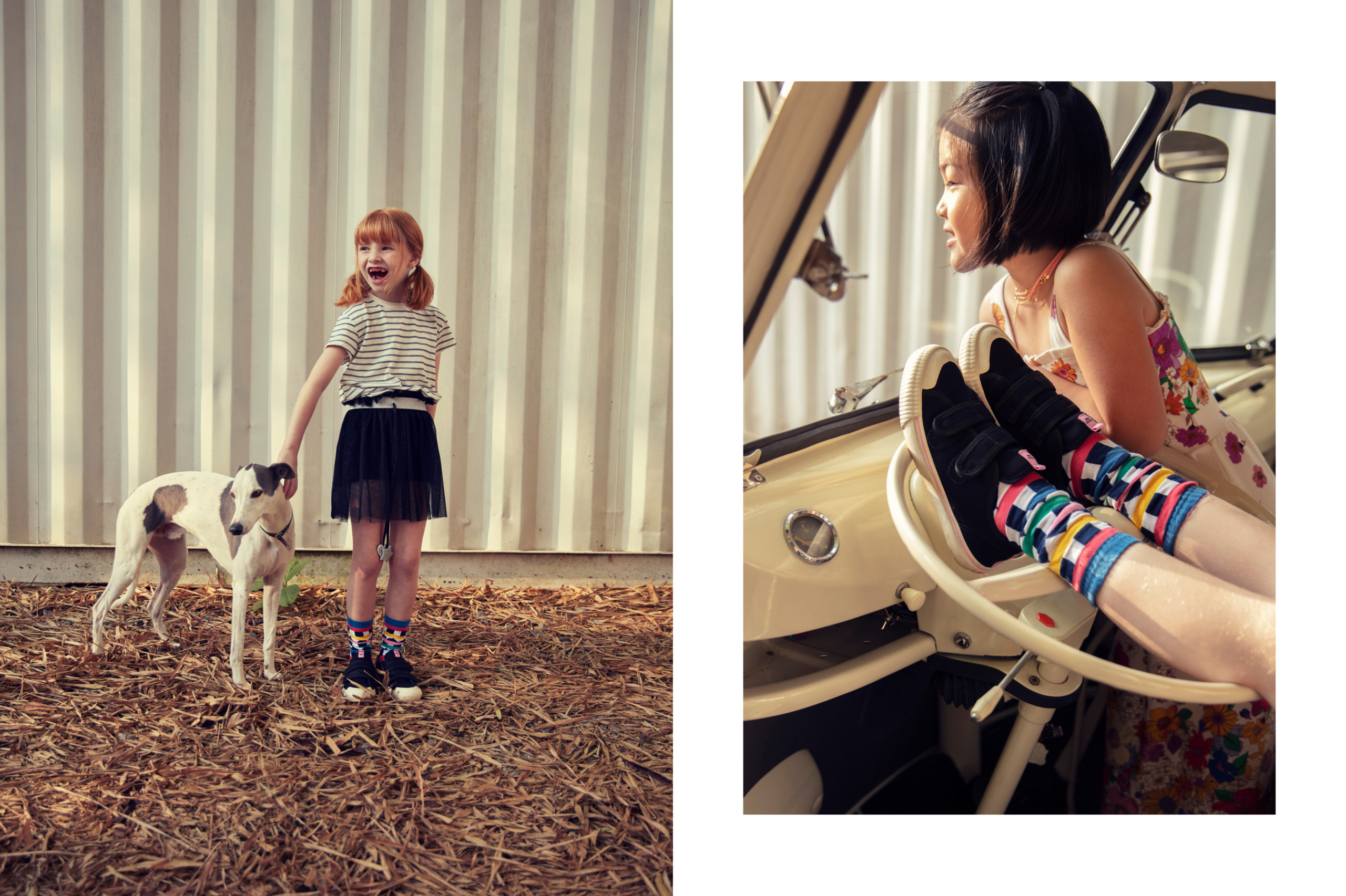 Na imagem da esquerda, Bibi usa moletom e blusa Amaro, saia Gucci e tênis Arezzo Bambini. Ao lado, Elisa está com blusa Isabel Capeto, saia de tutu Minha Avó Tinha, fivelas Feigel e papetes Arezzo Bambini