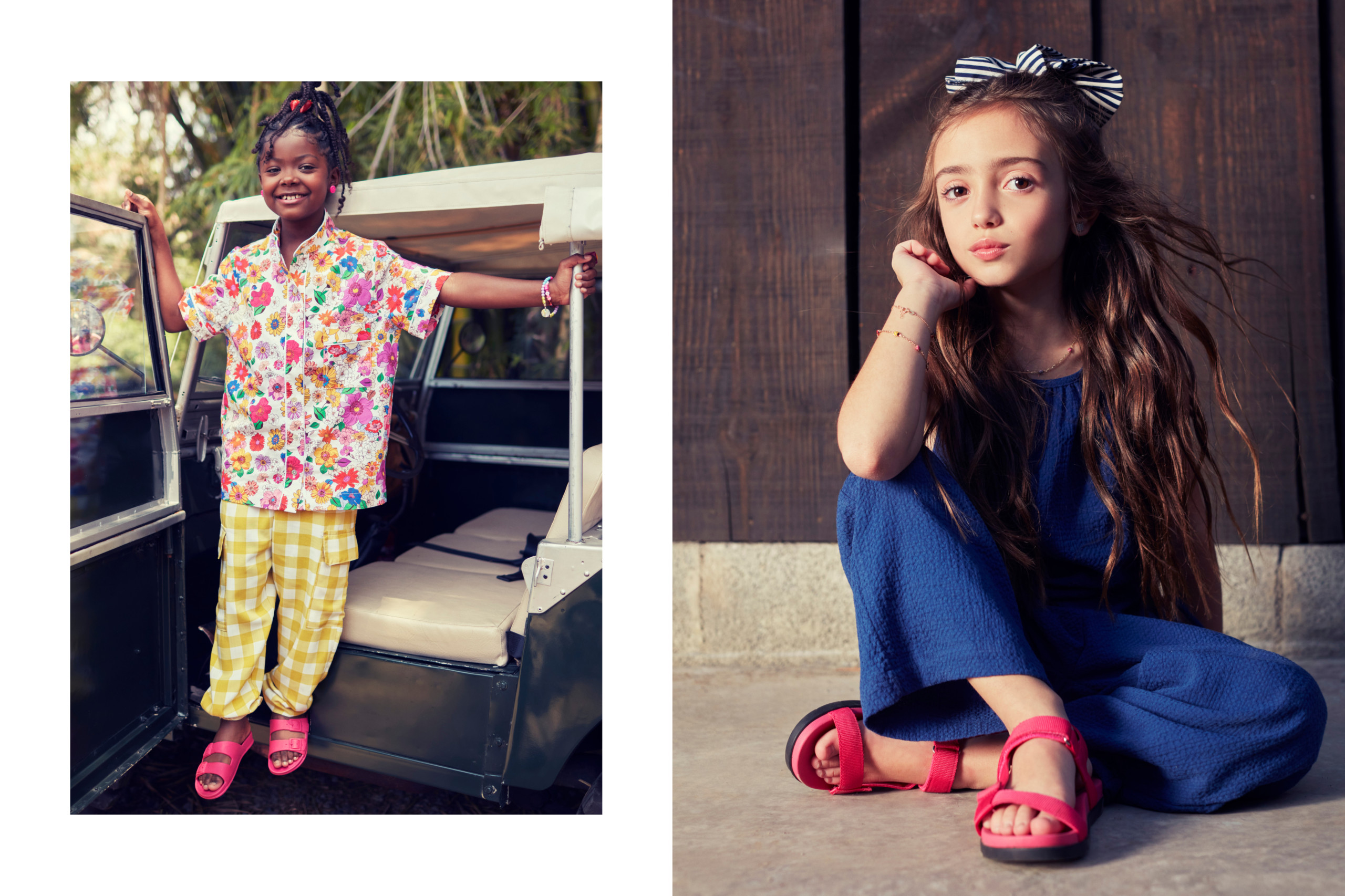À esquerda, Bibi usa camisa Mixed, calça A Mini e laço de cabelo Pinga. Na foto à direita, Bebela está de macacão Amaro e joias Beatriz Werebe