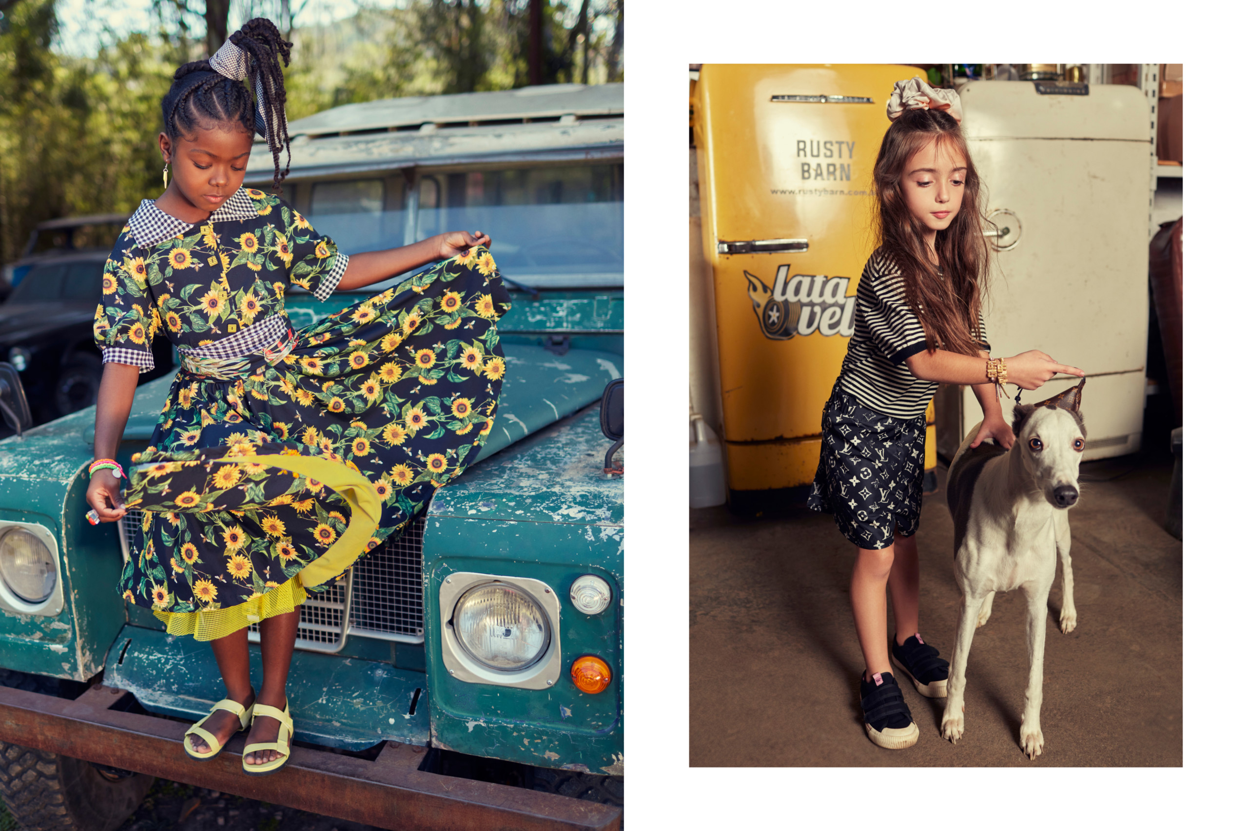À esquerda, Bibi usa vestido Lia Farrell para A Mini e papetes Arezzo Bambini. Bebela usa look total Louis Vuitton
