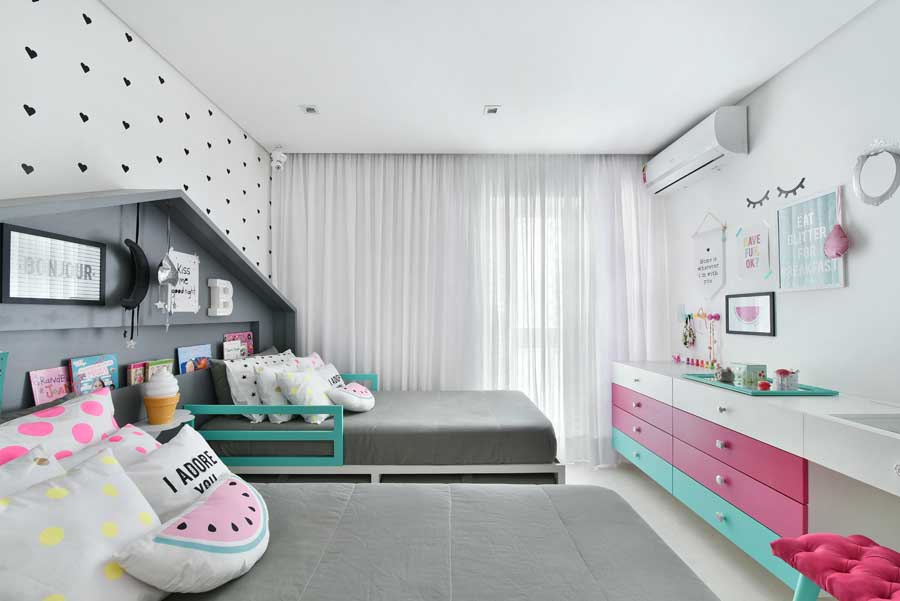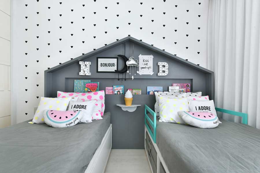 Na decoração do quarto das irmãs Nina, de 8 anos, e Bianca, de 5 anos, a composição pedida pela mãe para a arquiteta Andrea Eshkenazy, da Uêbaa Design, levou em conta a diferença de idade entre elas. Nesse enredo, a casinha, que serve como cabeceira para as camas das meninas e como apoio para livros e outros objetos, recebeu acabamento na cor cinza-chumbo.