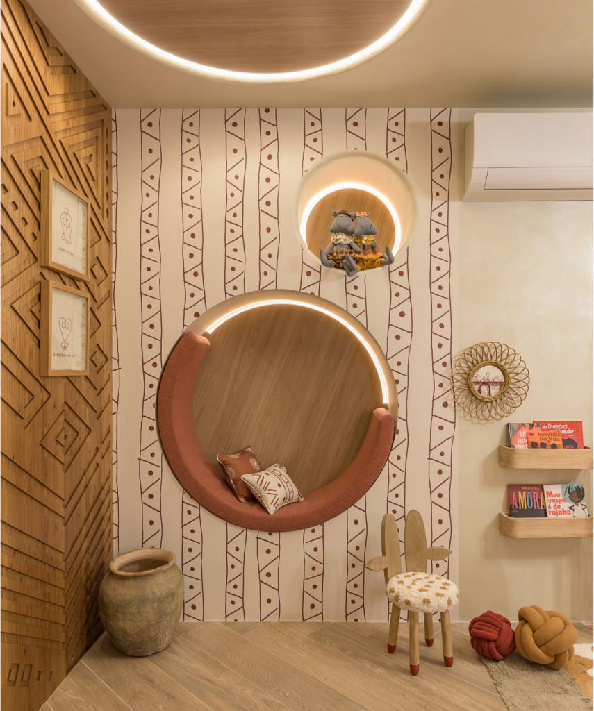 Batizado de Njinga, o espaço traz texturas e elementos simbólicos que remetem ao povo Mbundu, grupo étnico de Angola. No projeto, as materialidades do layout são representadas por meio da madeira, do sisal, do ferro e da palha. Kesley também assinou o mobiliário, os papéis de paredes e os enxovais em parceria com a grife Muskinha.