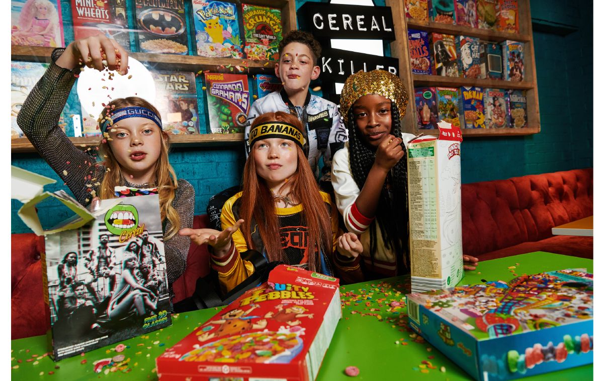 Prontos para descobrir quem é o culpado pelo cereal sempre acabar? Essa é a brincadeira que pontua o editorial supercolorido e recheado de modelagens sacadas dos anos 1980 para as crianças investigarem o tal “Cereal Killer”.