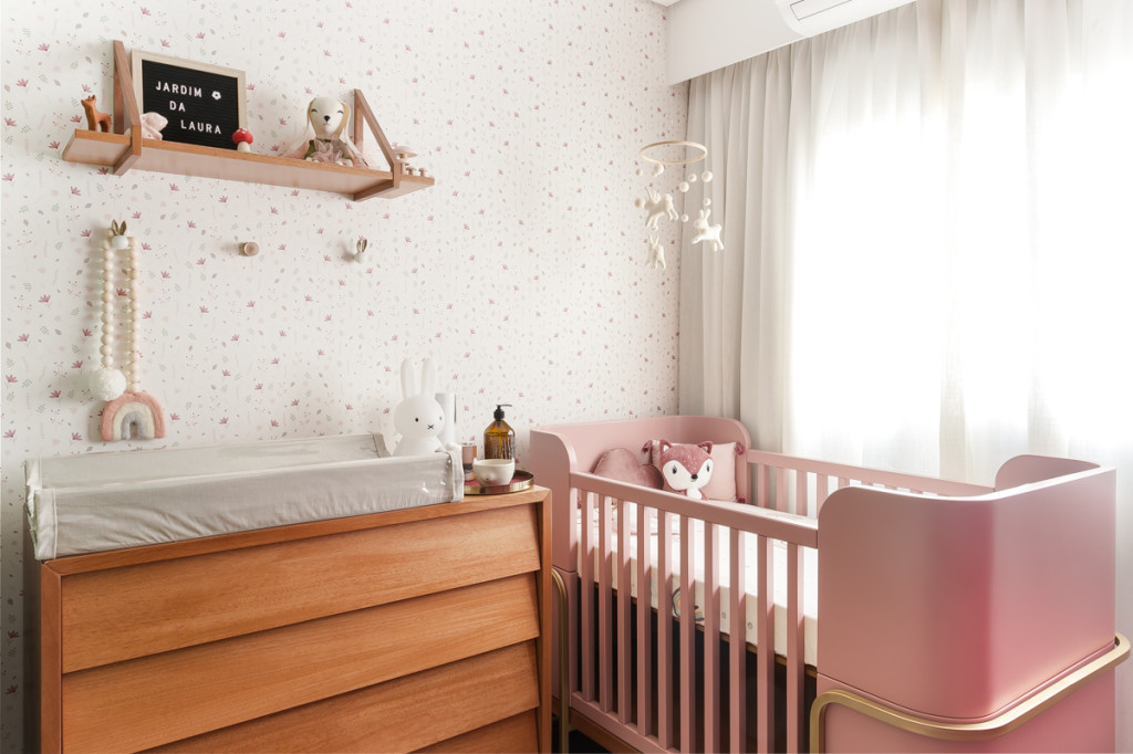 A paleta de cores foi recheada de fofurice, com burgundy, rose, verde e pinceladas de cru e de dourado. Para preencher o ambiente, Fê apostou no berço Vegas e na cômoda Vovô, ambos da Ameise Design. “A união das duas peças foi mesmo ideal, já que eu queria um ponto sutil de cor no mobiliário (o rosa do berço) com o toque neutro e elegante da madeira.”
