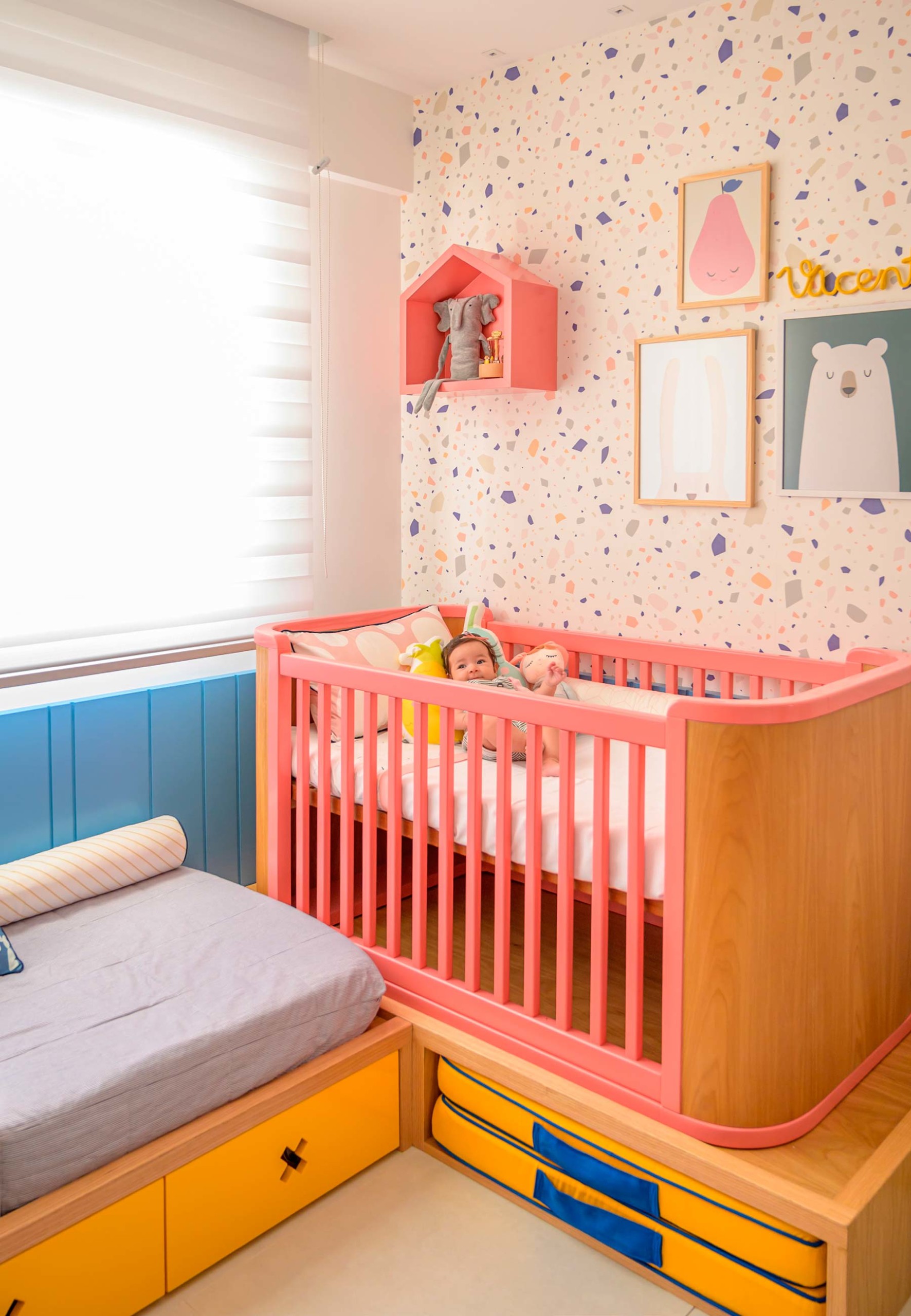 Escalada para a tarefa, a arquiteta Tatiana Machado, proprietária da Elefante Design, buscou soluções práticas e criativas para garantir a satisfação dos clientes. “Resolvemos deixar o berço na altura da cama para apoiá-lo sem os pés, e escolhemos um modelo de trocador retrátil preso na parede para liberar mais espaço no quarto”, diz.