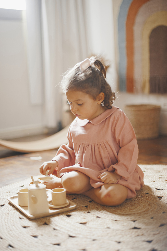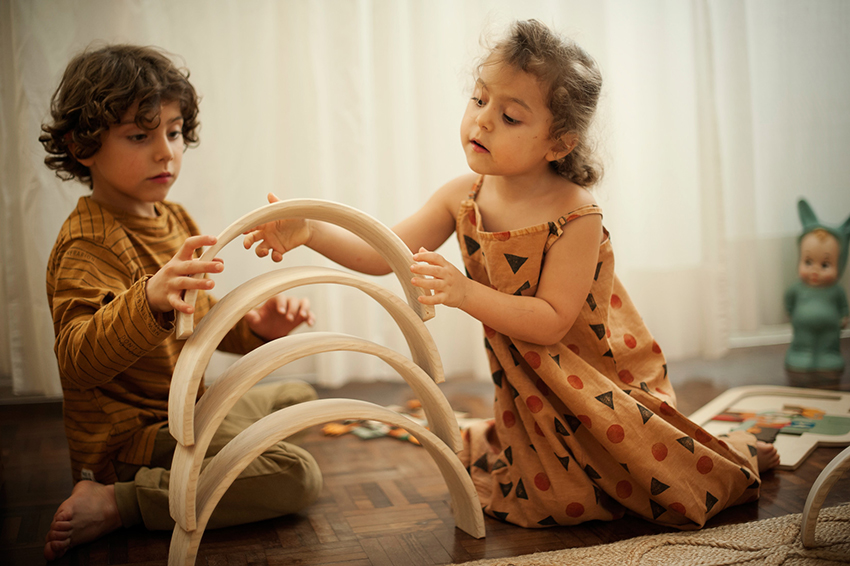 “Temos um bosque de Mata Atlântica onde brincamos e caminhamos quase todos os dias. Então, surgem gravetos, folhas, pinhas que sempre entram na brincadeira. Esses são os verdadeiros ‘brinquedos naturais’ que se juntam aos artesanais”, diz ela. “Meu pai faz esculturas em madeira desde que eu era pequena, todos esses elementos acabam relacionados uns com os outros. Me lembro de um carrinho de bonecas meu, quando criança, todo em vime. Quanto mais simples, mais a criança consegue inventar e criar em cima daquilo”, completa ela.