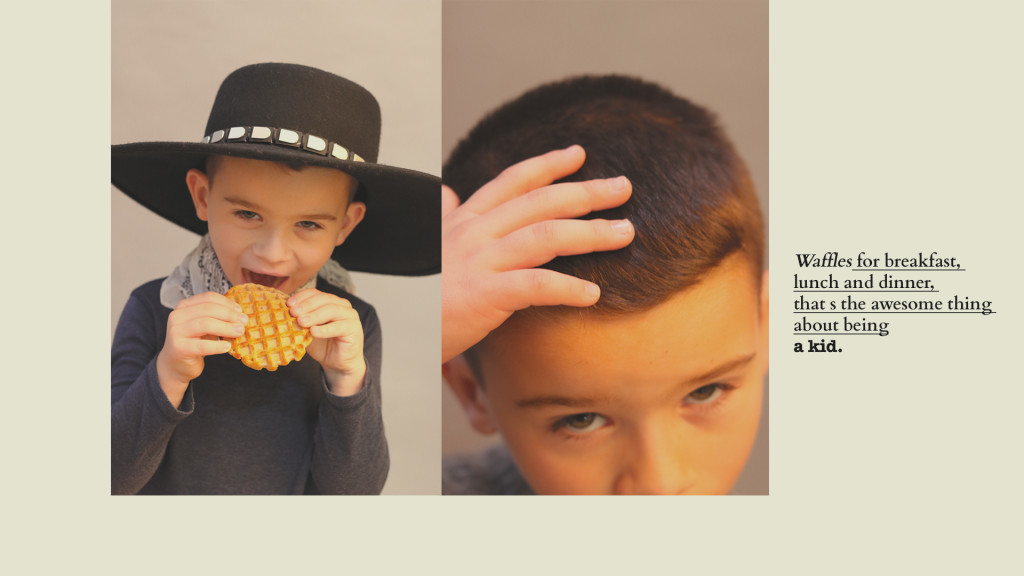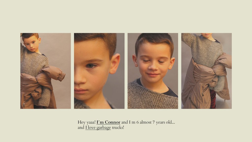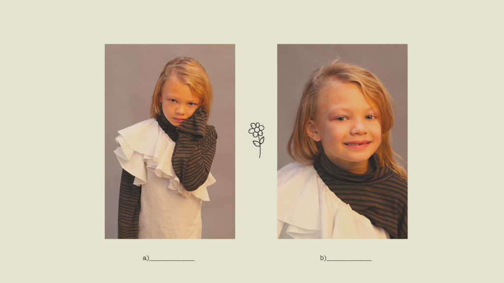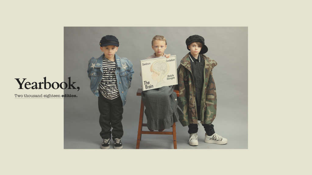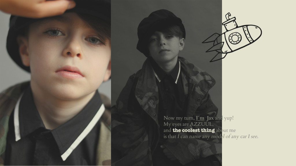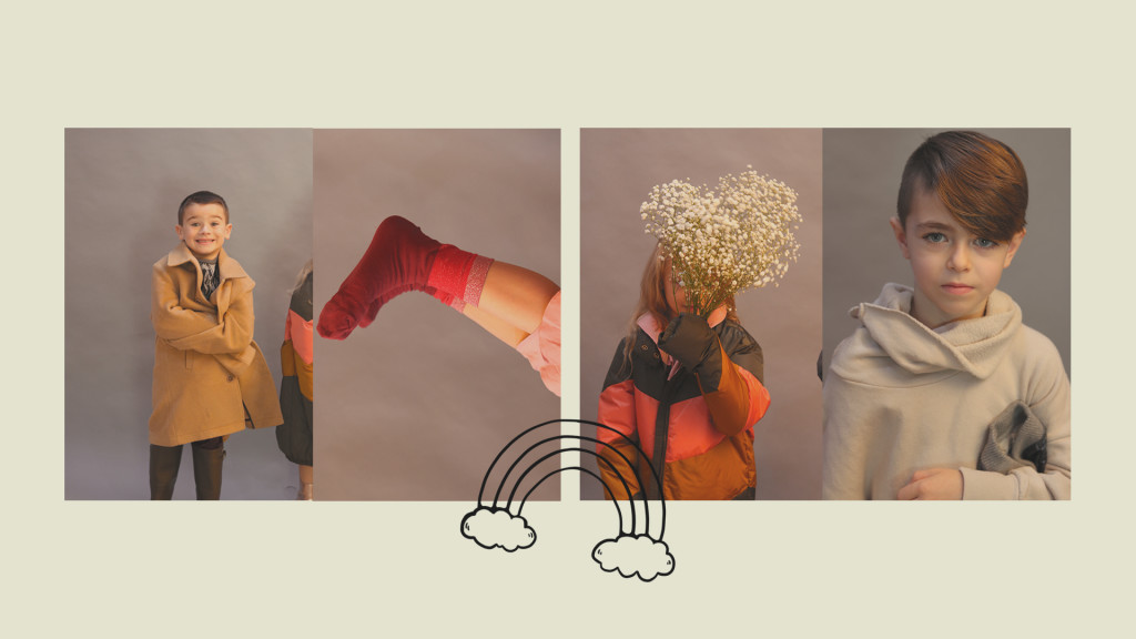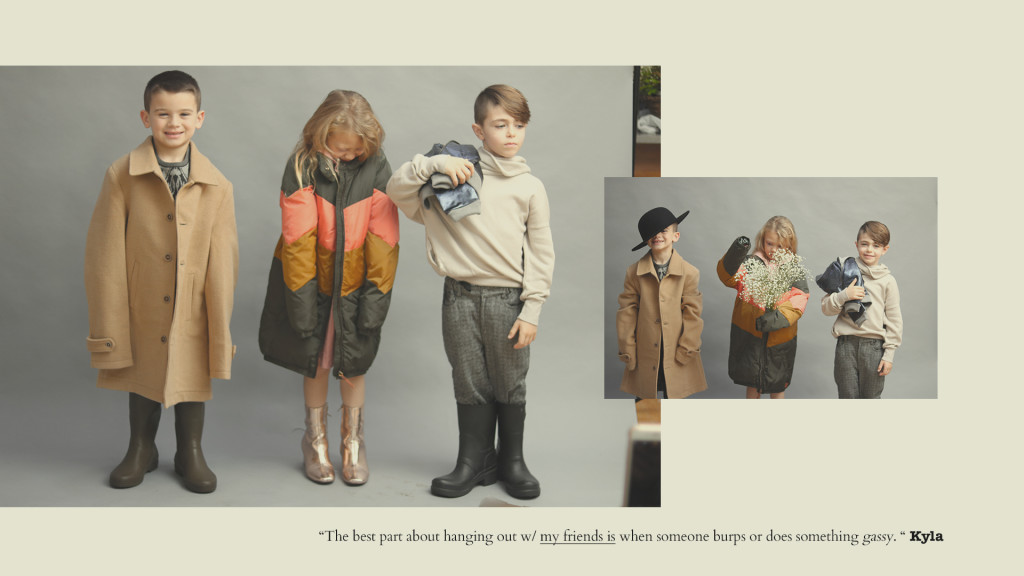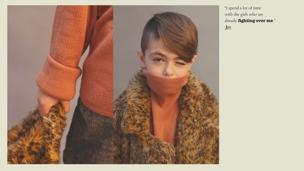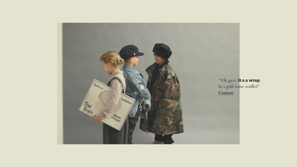 Kyla de blusa de gola alta, Long Live the Queen, saia, Sissonne (@luibelle). Connor de jaqueta, J.Crew, camisa, Kid & Kind (@luibelle), calça, Louis Louise (@luibelle), tênis, Vans e boina, acervo. Jax de boina, acervo, camisa, Karl Lagerfeld, jaqueta, vintage, calça, Deux par Deux (@luibelle), e tênis, Kenzo