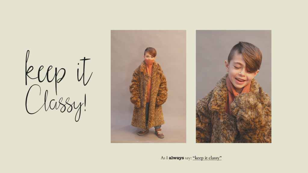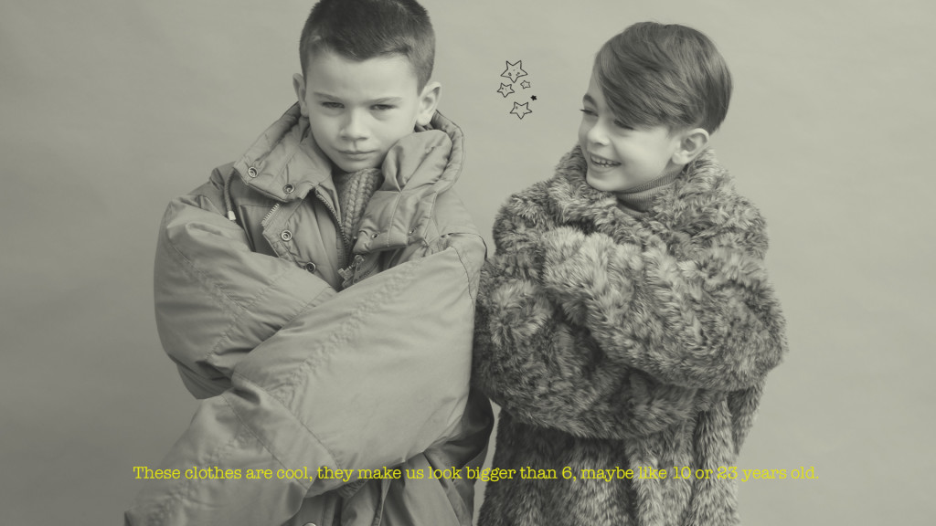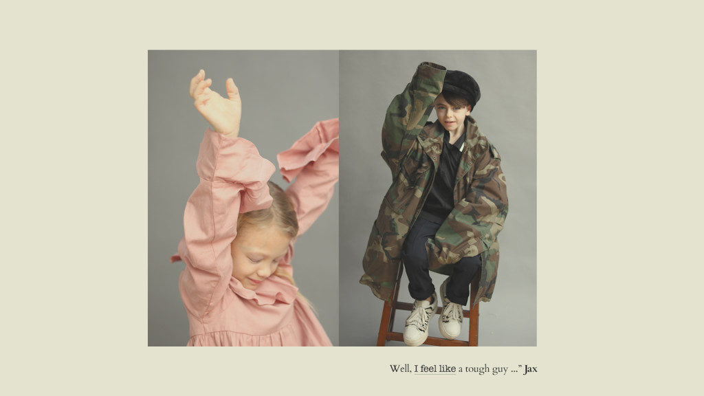 Kyla de vestido, Coco au Lait. Jax de jaqueta, vintage, camisa, Karl Lagerfeld, calça, Louis Louise, e sapatos, Kenzo