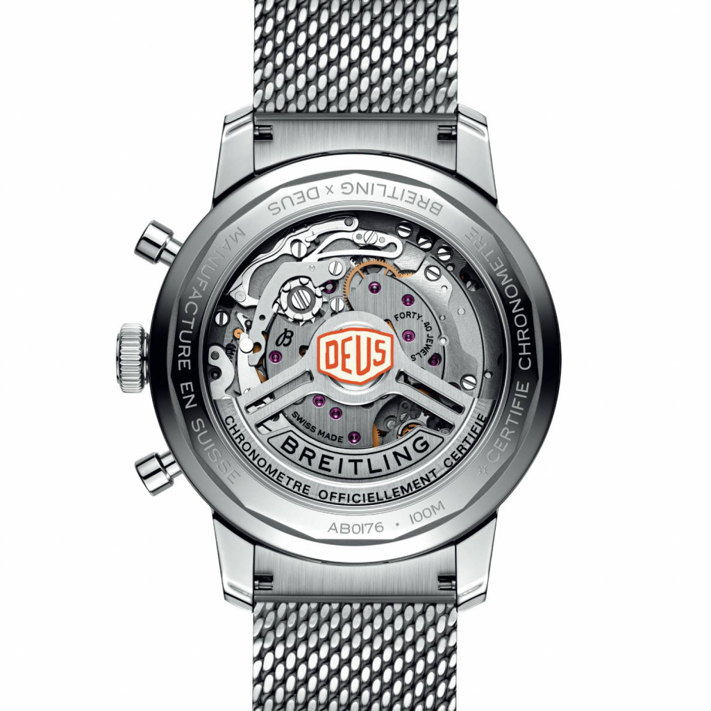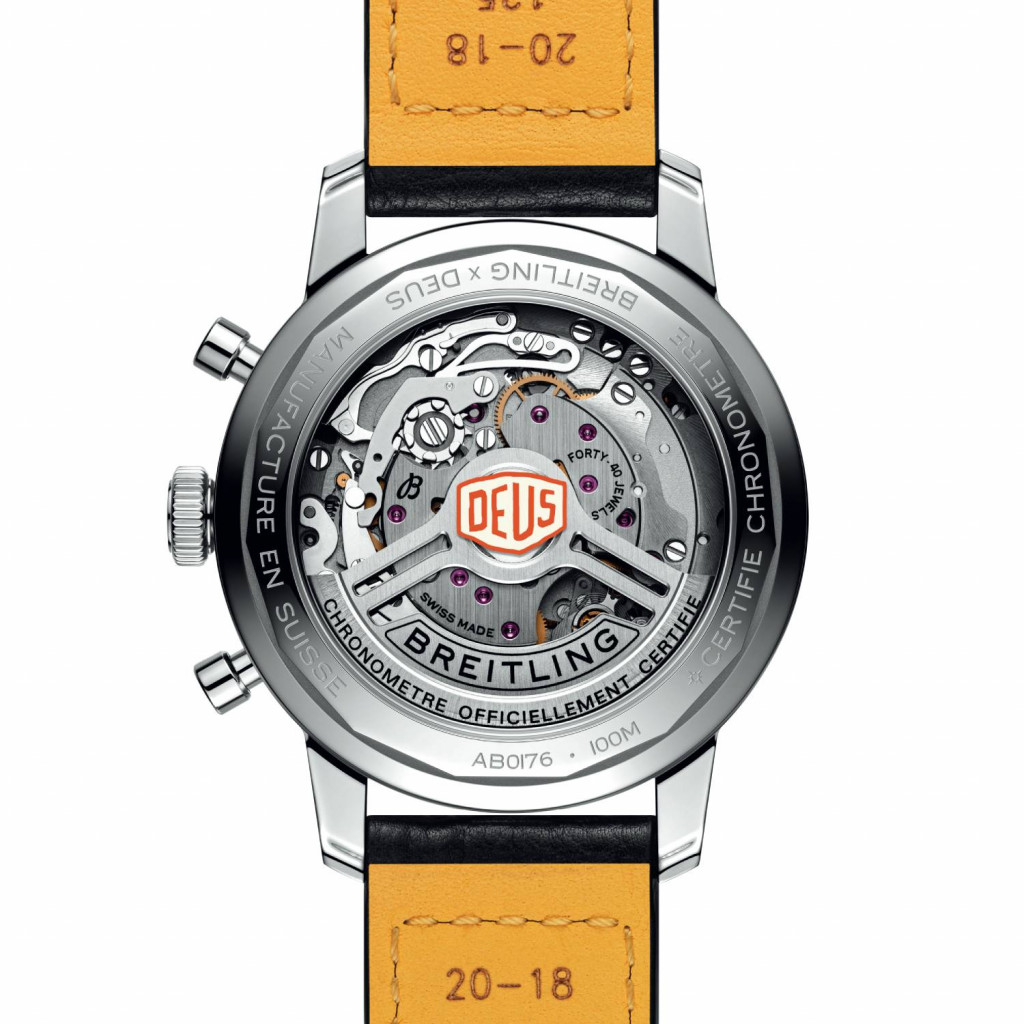 O motor por trás deste relógio é o calibre manufaturado Breitling 01, cujo fundo de caixa em cristal de safira transparente apresenta o logotipo vermelho da Deus Ex Machina.