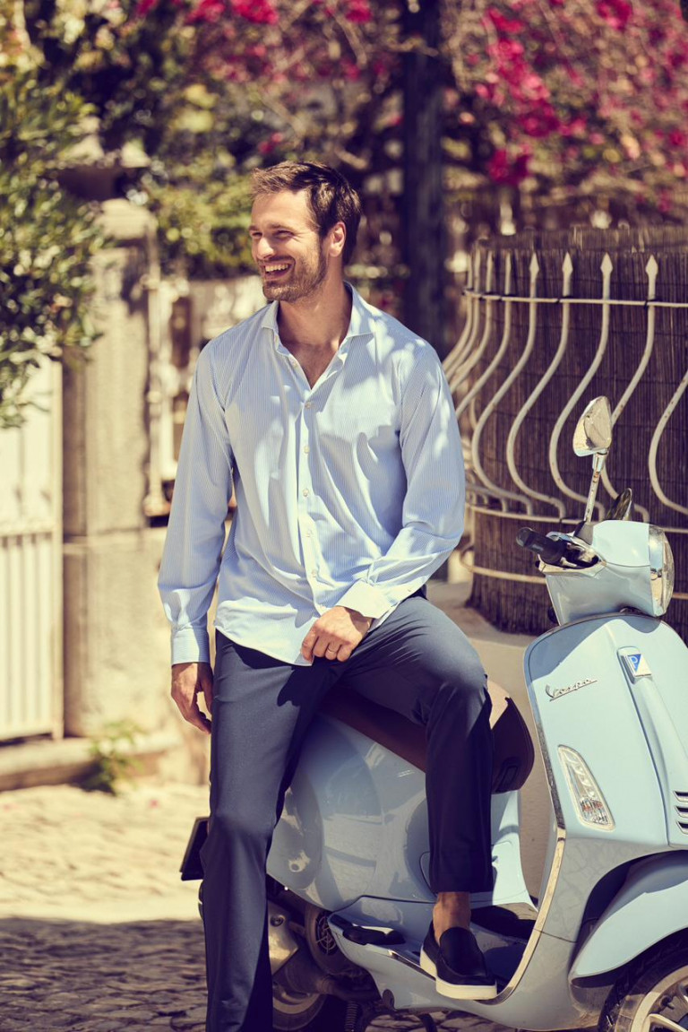Tecidos nobres, como Pura Lã extrafina, Algodão Pima e Linho, convivem com materiais tecnológicos, garantindo caimento impecável, conforto térmico e performance diária. A paleta de cores neutras — azuis, cinzas, tons terrosos e brancos — reforça a sofisticação discreta e a atmosfera marítima que inspirou a coleção.