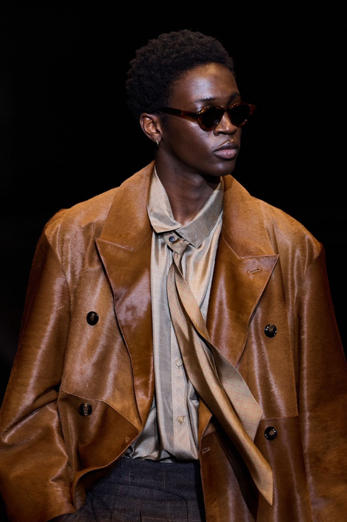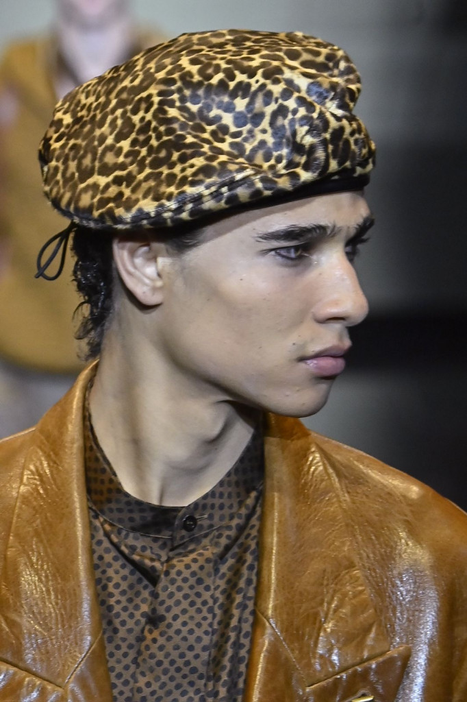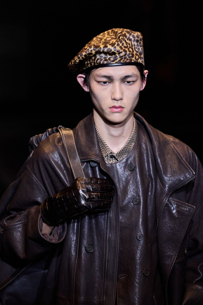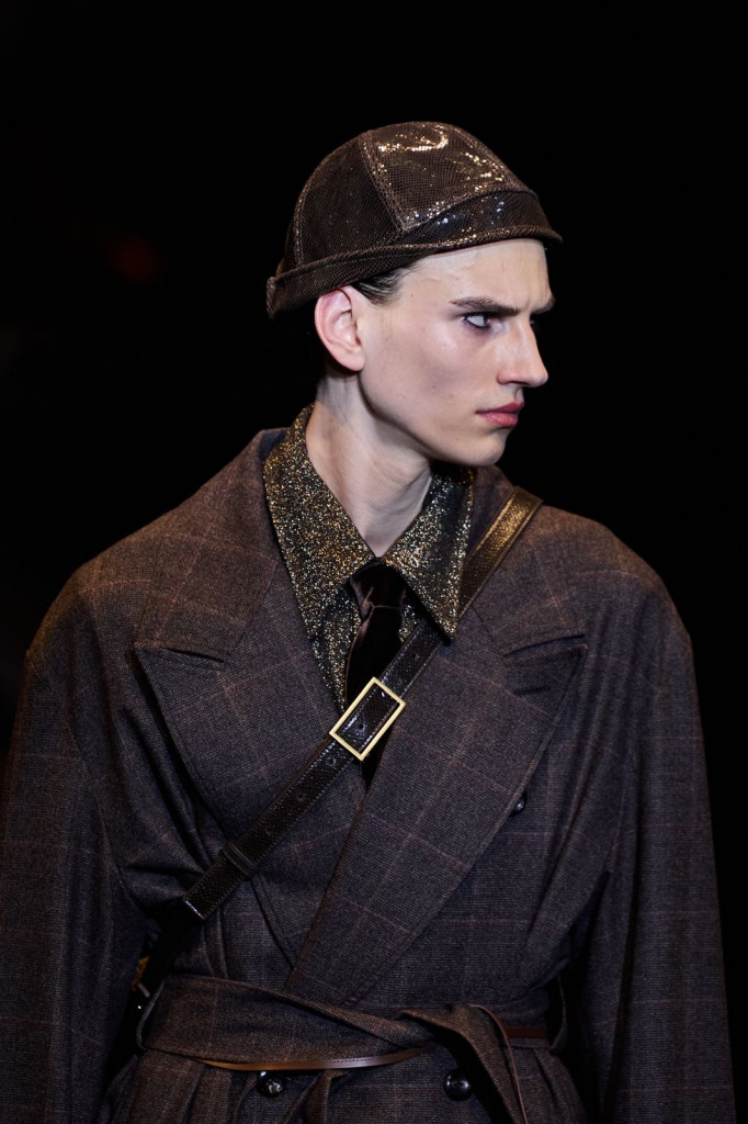 Casacos longos com bolsos amplos, variações em couro ou pele, e calças soltas com pregas destacaram-se como peças-chave, enquanto chapéus em diferentes formas adicionaram um toque moderno aos códigos tradicionais da marca.