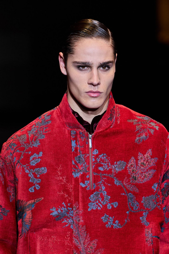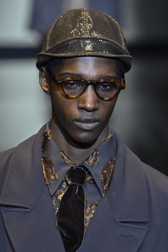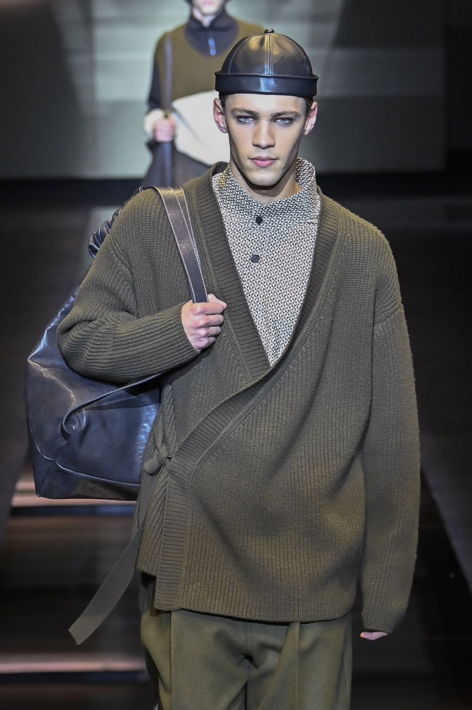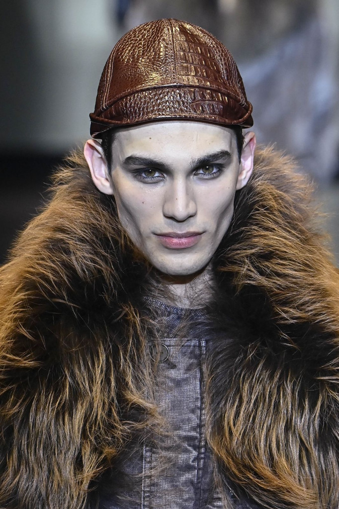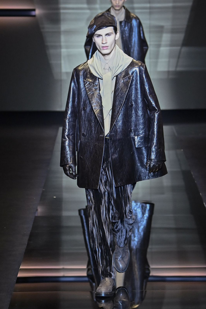 Casacos longos com bolsos amplos, variações em couro ou pele, e calças soltas com pregas destacaram-se como peças-chave, enquanto chapéus em diferentes formas adicionaram um toque moderno aos códigos tradicionais da marca.