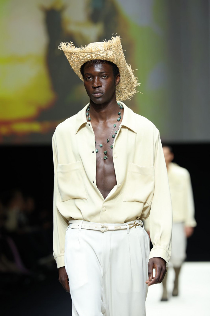 A coleção apresentada é leve, com formas amplas, ternos super fluidos amarrados com cintos, macacões e conjuntos militares soltos. Os mocassins são deslumbrantes, e a paleta de cores varia entre bege e verde oliva, aquecendo-se com tons de roxo e vinho. Essa seleção reflete o legado de Giorgio Armani, marcado por energia, bronzeados e imagens de cavalos galopantes exibidas em telas ao redor da passarela, que animaram todo o desfile.
