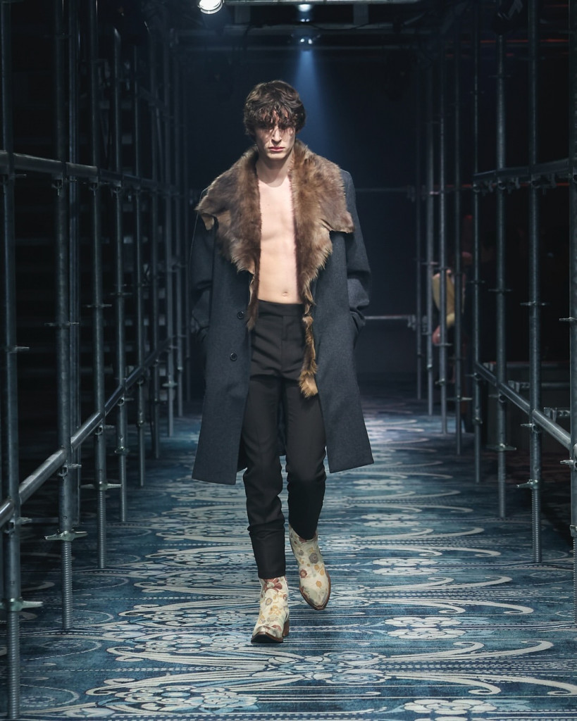 O instinto, aqui, torna-se tanto assunto quanto método: a trilha, que mistura Magpie Symphony, de Rossini, com On the Lake, de Shigeru Umebayashi, torna a imprevisibilidade do instinto evidente. Nas roupas, que são um convite para nos libertarmos de regras, a genialidade da dupla se expande ainda mais. Peças reeditadas de outras coleções, como bolsas e botas cowboy, ou até mesmo as malhas que lembram a marca de Raf Simons pré-Prada, se complementam com amuletos de metal pendurados em camisas sem significado específico e peles que simbolizam um tipo de proteção sem muita lógica.