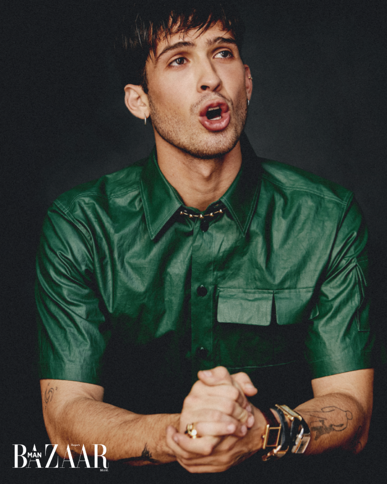 Oriundo de uma família musical – ele é filho do cantor Leonardo –, não à toa, é a melodia que faz sua vibração encontrar a tônica da interpretação. Ela provoca sensações e sentimentos, às vezes memórias, e é nessa cadência que encontra seu porto seguro. “Me dá ritmo para viver desde quando eu ‘tô’ muito animado e feliz, entediado ou quero relaxar. Se tiver meio chateadinho, passo a chorar em dois minutos”, explica. Mas os planos de se embrenhar no ofício do pai não estão no horizonte. “Hoje em dia, tenho todo o apoio, me elogia, fala de mim, é sempre muito carinhoso com o meu trabalho.” Ciente da sua profissão, não quer o dinheiro ou os privilégios de um nepo baby. “Sou ator. Preciso focar em ser bom em alguma coisa, porque não vou fazer nada meia-boca”, crava.