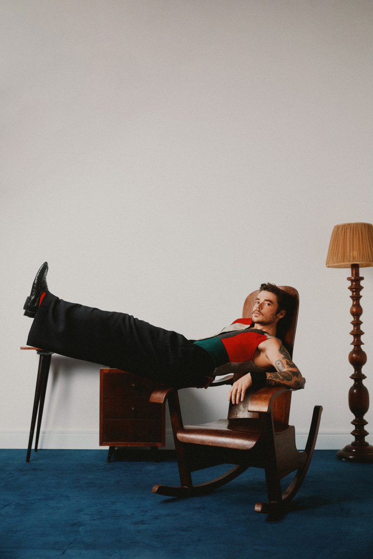 João Lucas – Foto: Mateus Aguiar, Stylist: André Braune, Assistente de stylist: Danton, Beleza: João Miranda, Direção criativa: Nidia Aranha, Set design: Emille Martins e Cenários: Galpão 8