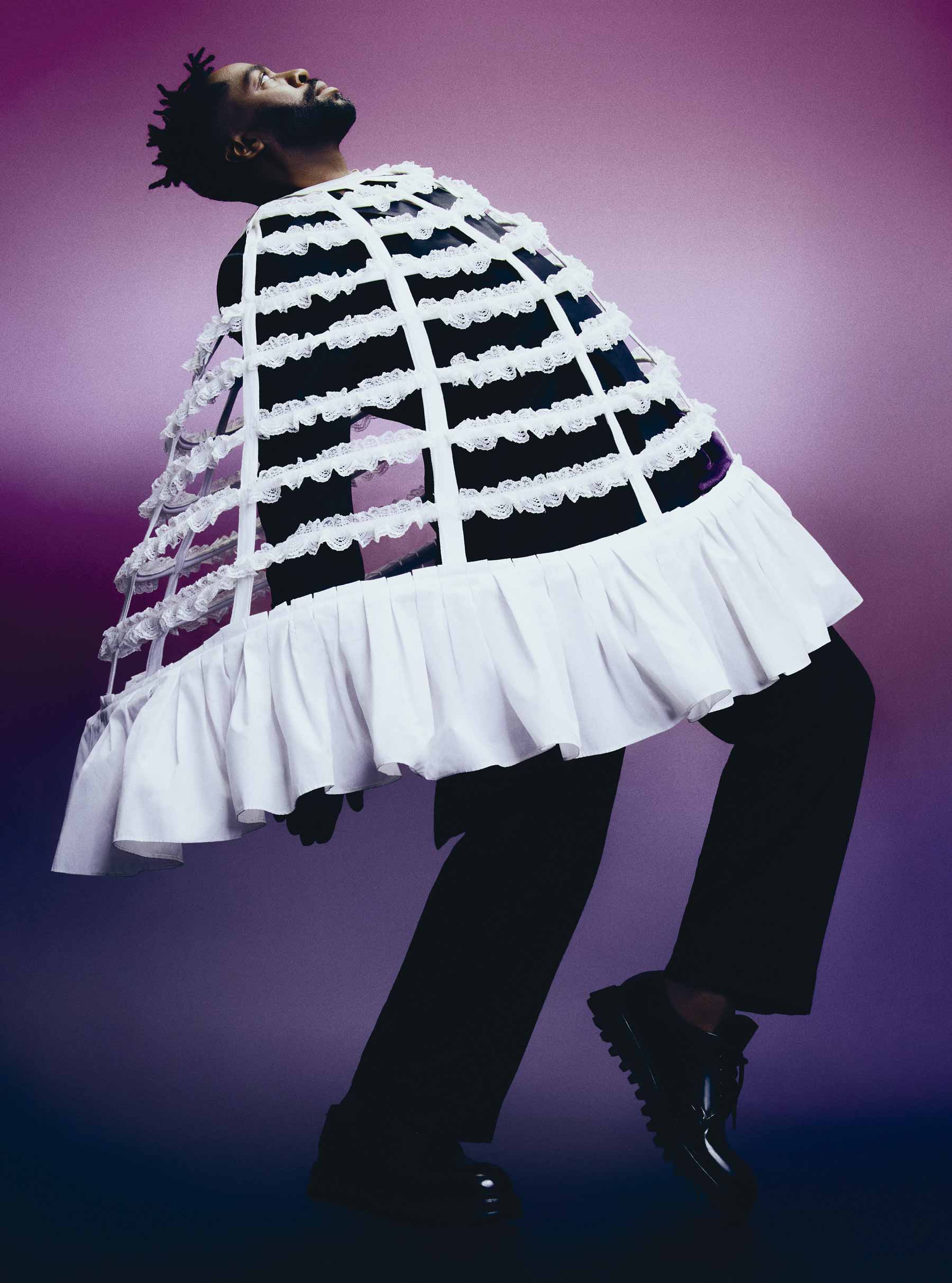 Blazer Normando, calça Zegna, saia crinolina Madame Sher, luvas Moun Off e sapatos Dolce & Gabbana – Foto: Marina Zabenzi, com direção criativa de Leticia Haag, styling de Bruno Uchoa e beleza de Ian Ribeiro