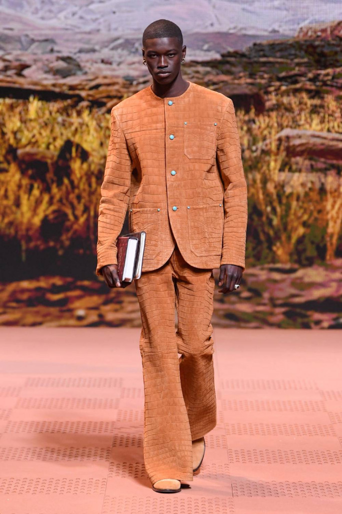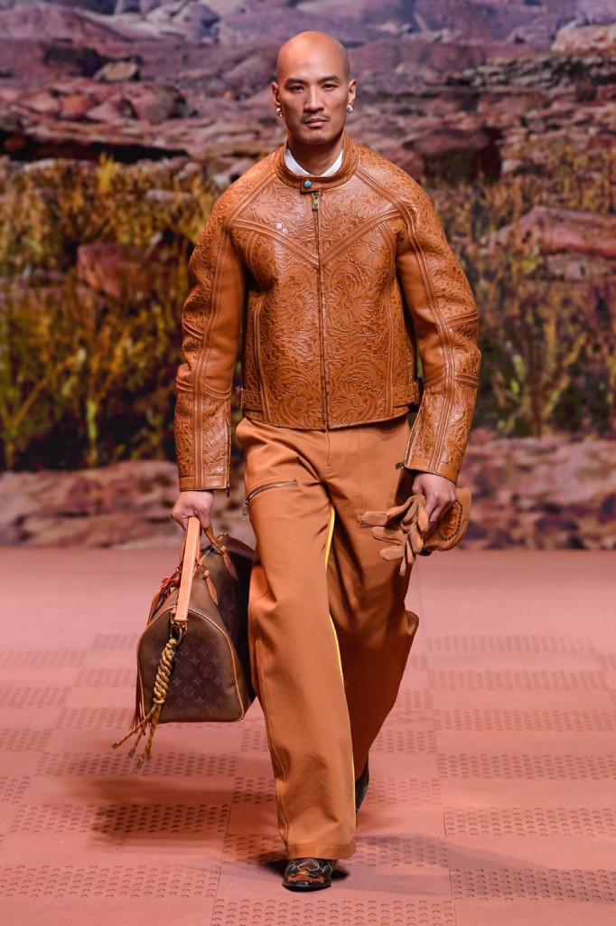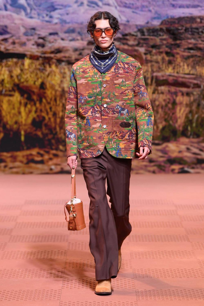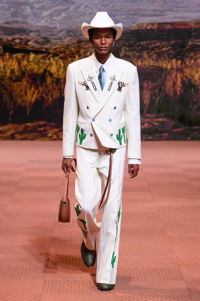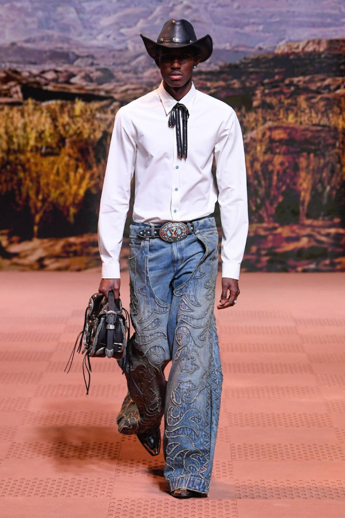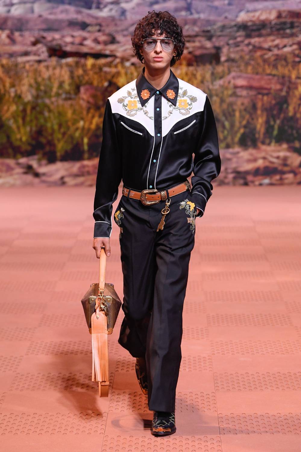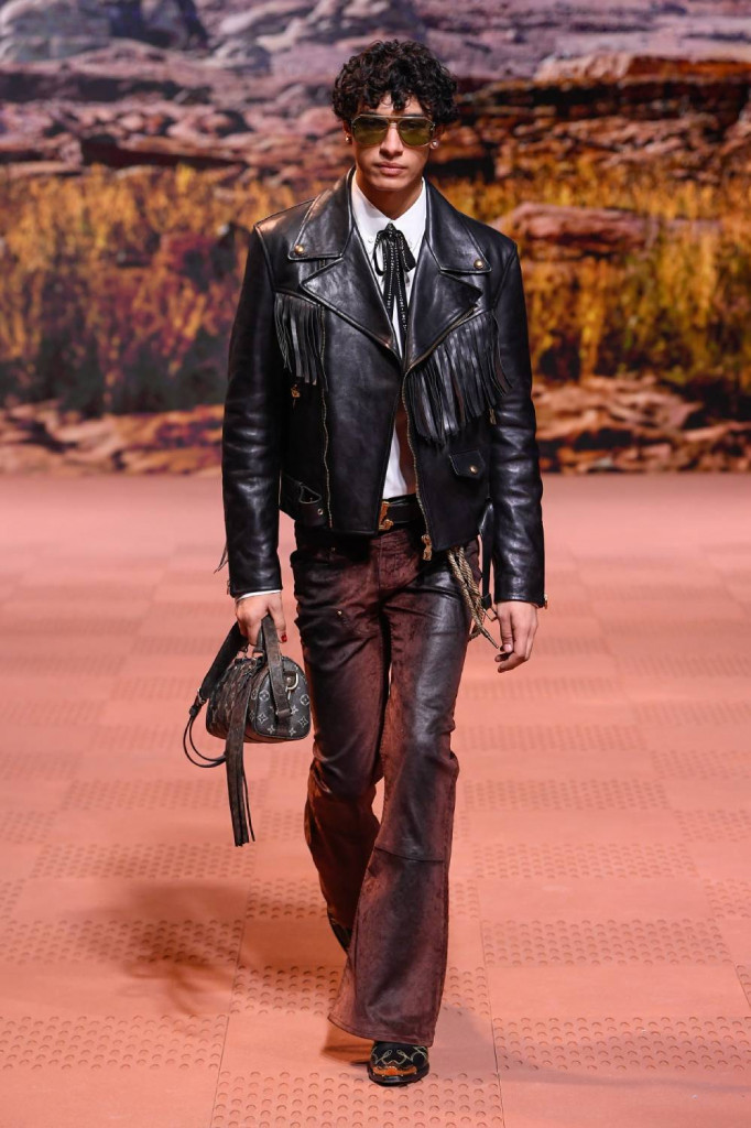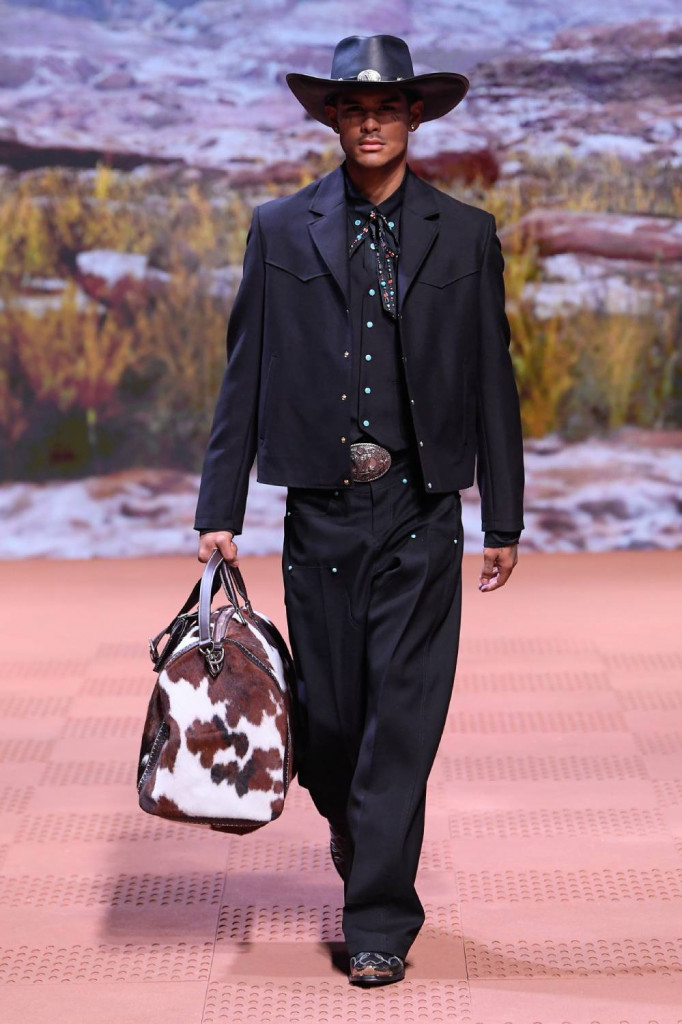Primeiro vieram os cowboys, depois os hippies e, agora, Pharrell Williams. Mas o quão Western é a moda Western, mesmo? Na Louis Vuitton, vieram botas em collab com Timberland, jaquetas de couro, cintos maximalistas, chapéus, franjas, flanelas, chicotes, gravatas ‘bolo’ e estampas vaqueiras – tudo em paletas terrosas. Na trilha sonora, o bang-bang foi substituído por tambores tocados por indígenas ao vivo. Os detalhes mais charmosos? Botões de turquesa, a “pedra da vida” dos nativos americanos.