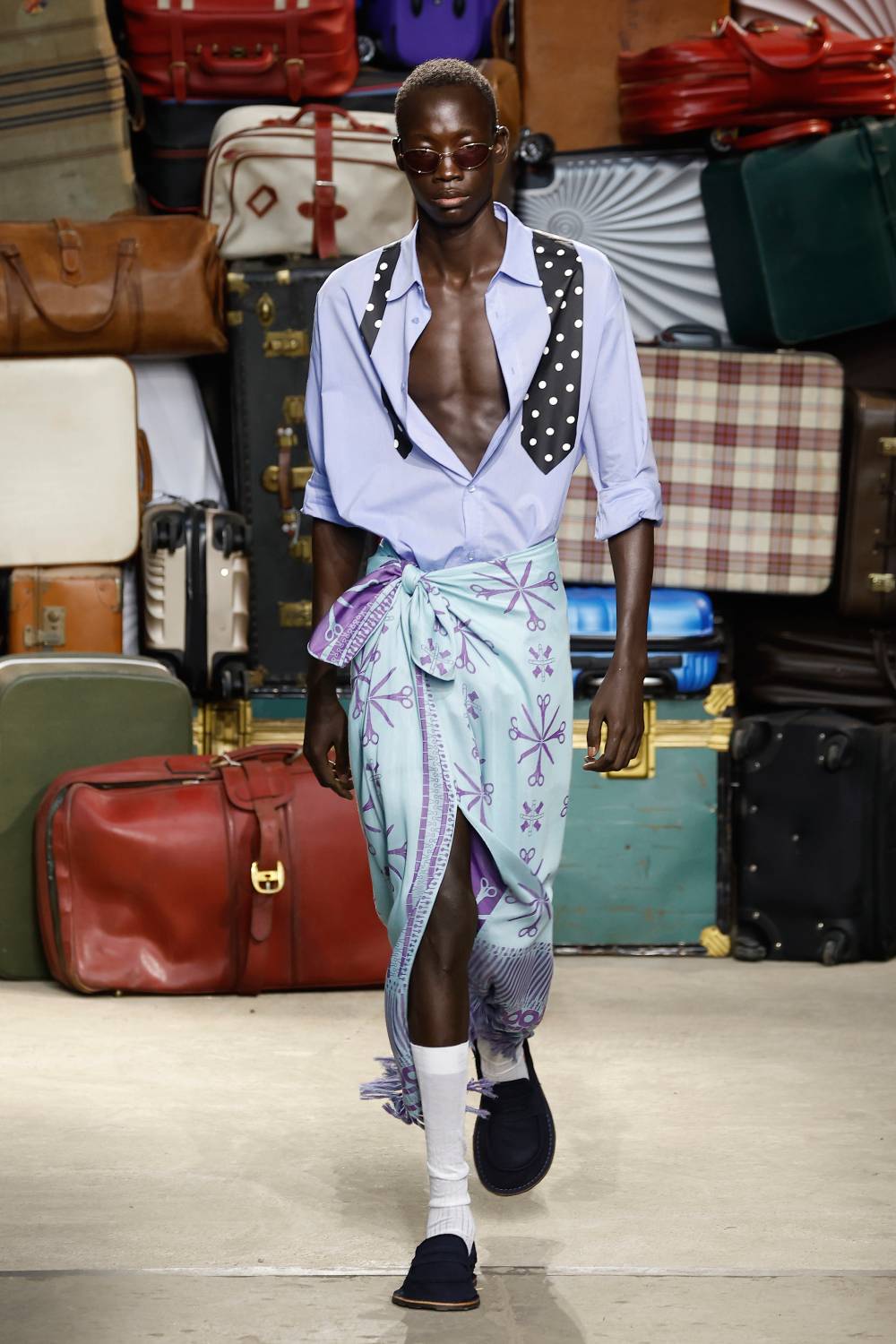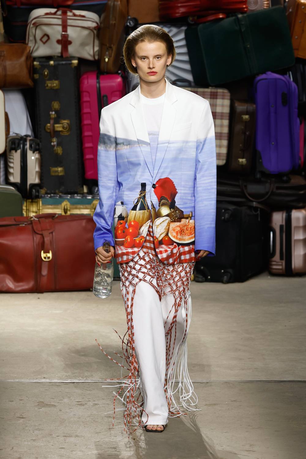 O resultado foi um desfile distinto do que todo mundo está acostumado, a começar pelo cenário: mais bruto, com muitas malas empilhadas e um chão de madeira sem polimento, como quem chega de férias em algum píer da Itália. A temática se passa toda em volta de um verão inesquecível em uma praia do país europeu, o que fica mais evidente nas estampa – em uma delas, uma mesa veramente italiana vai para um caminho surrealista. Entre os outros desenhos, ovos fritos, Smile, nuvens e patos.