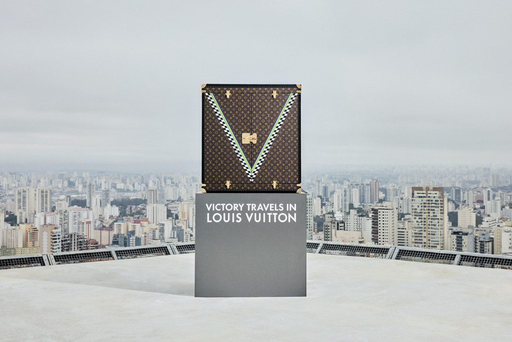 No Trophy Trunk paulistano, o icônico Monograma da casa ganha releitura inédita, adornado pelo V — de Vuitton e de Vitória — e pelo diálogo entre as cores nacionais, verde, azul e amarelo, mais o preto e branco que forma o padrão Damier, remetendo à desejada linha de chegada da corrida, promessa de pódio.