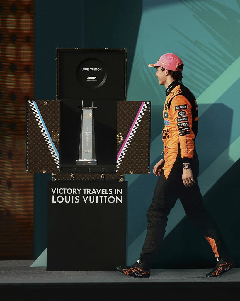 Abraçando o troféu da vez com pompa e circunstância, o baú é exibido já no grid de largada como símbolo manifesto da adrenalina da vitória, voltando ao protagonismo no final do páreo. No meio do caminho, o nome Louis Vuitton será exibido de forma gráfica na sinalização da pista do autódromo integrada ao circuito. Do ateliê às curvas, um mix de mundos movidos pela mesma ambição de desafiar limites.