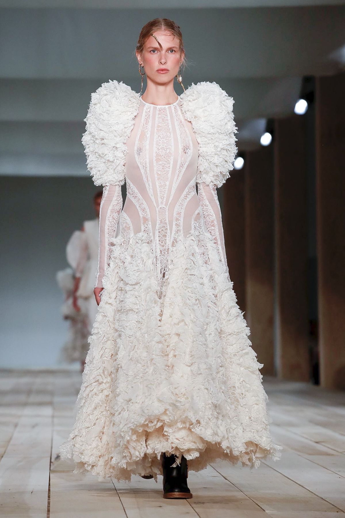 No melhor estilo da assinatura de Alexander McQueen, vemos o drama presente no look da foto acima. Os recortes de renda aplicados em formas orgânicas adicionam um desenho específico ao modelo, que também é enriquecido por mangas bufantes. A transparência, neste caso, aparece de forma poética, garantindo delicadeza ao visual noiva.